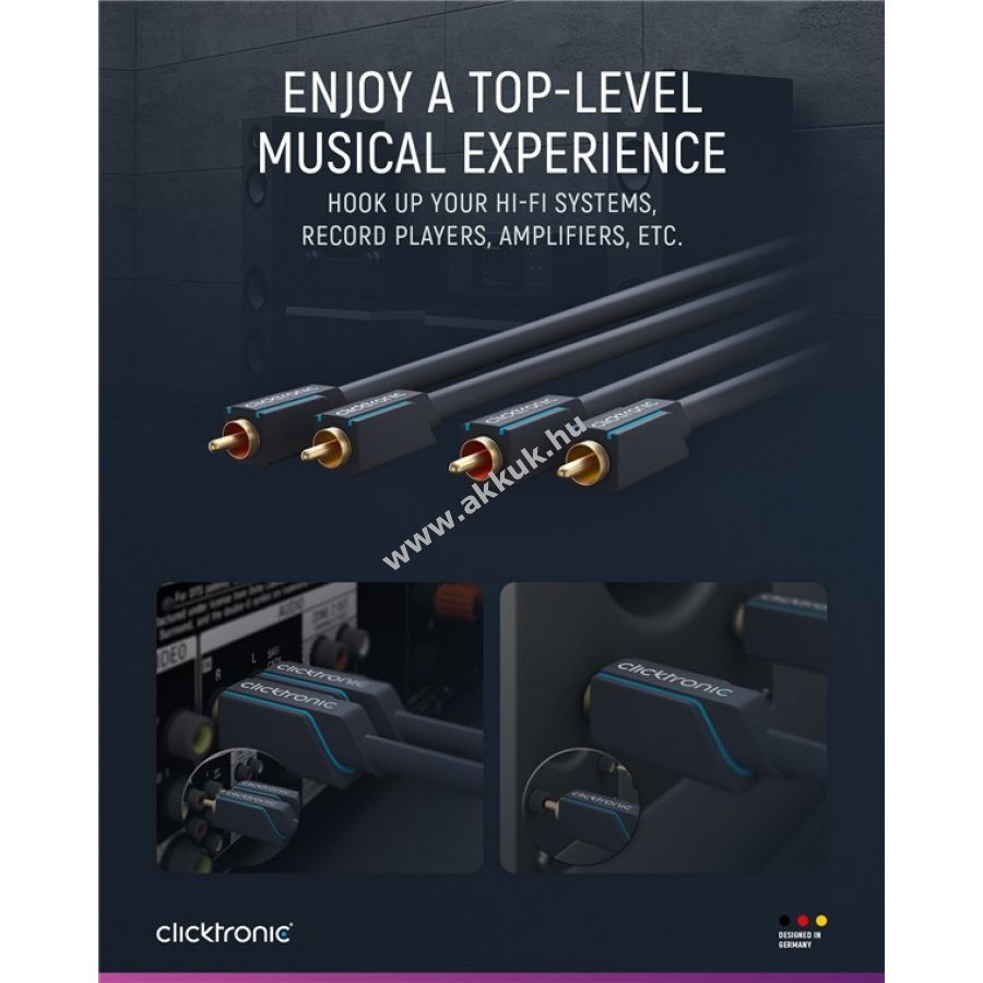 A Clicktronic cinch kábel tartósságra és stabilitásra készült 10 év garanciával. A háromrészes PVC és ABS csatlakozóvédelem megakadályozza a kábel törését hirtelen húzás esetén. Kiváló minőségű aranyozott, rozsdamentes fém érintkezők és 99,9% oxigénmentes réz vezetők biztosítják a tiszta sztereó hangátvitelt. Univerzálisan használható otthoni mozirendszerekhez televíziókhoz hangszórókhoz mélynyomókhoz erősítőkhöz Hi-Fi rendszerekhez és DJ keverőkhöz. 24 karátos aranyozás minimális jelveszteséget és kristálytiszta hangzást garantál. A koaxiális kábel optimális adatátvitelt biztosít. Rugalmas és erős PVC külső burkolat könnyű hajlítást és szerelést tesz lehetővé. Kétszeres árnyékolás alumíniumfóliával és rézhálóval a kiváló jelminőségért.