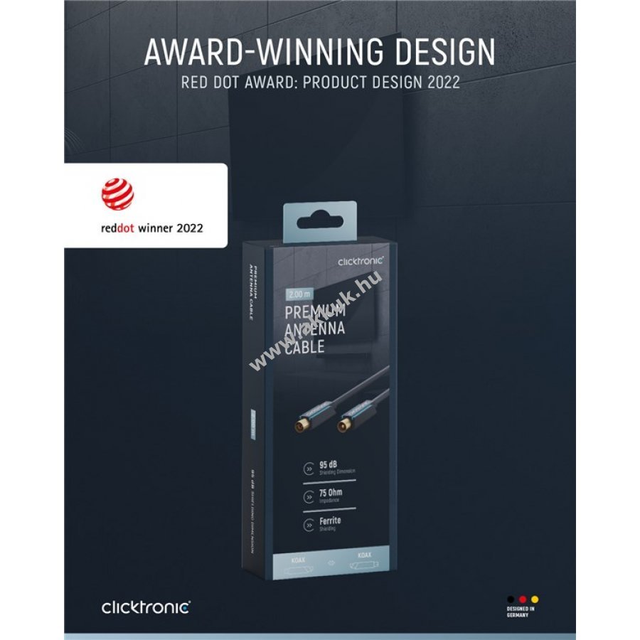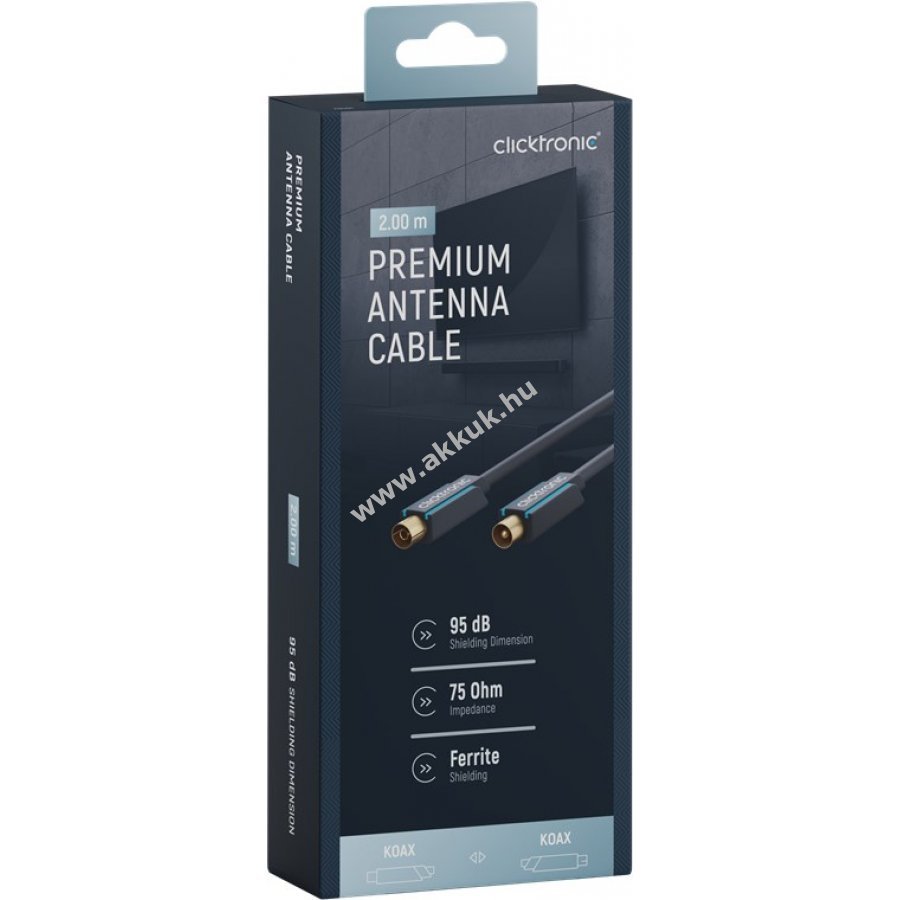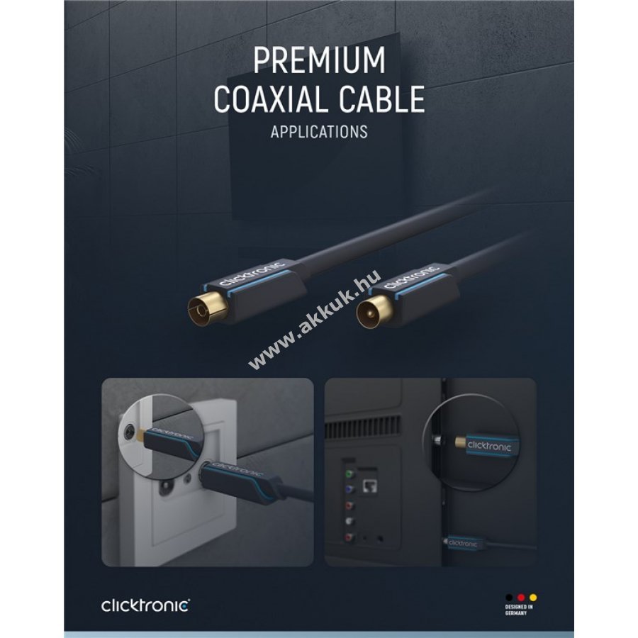A Clicktronic prémium koaxiális kábel hosszú élettartamot és stabil kapcsolatot biztosít 10 év garanciával. A háromrészes PVC és ABS csatlakozó szerkezet védi a kábelt a sérülésektől és törésektől. 24 karátos aranyozott fém érintkezők és tiszta réz vezetők gyors adatátvitelt garantálnak. A strapabíró PVC külső burkolat védi a kábelt és biztosítja a tartós, stabil jelet.