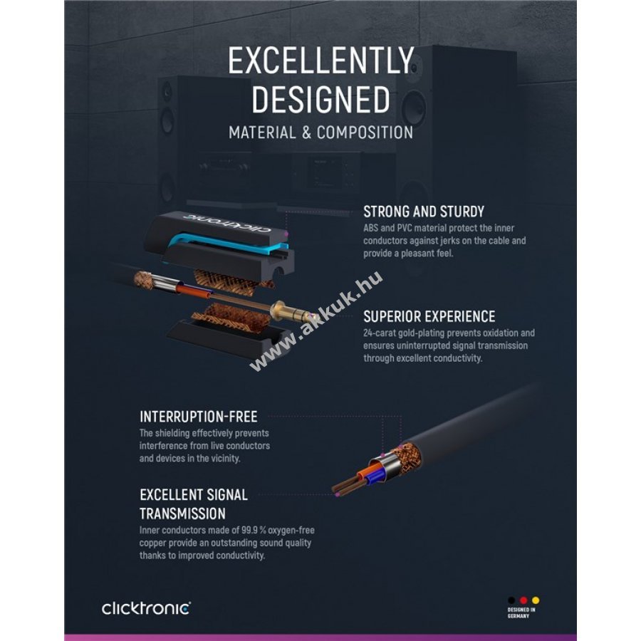 24 karátos aranyozott, rozsdamentes fém érintkezők és tiszta oxigénmentes réz vezetékek biztosítják a kiváló hangátvitelt.