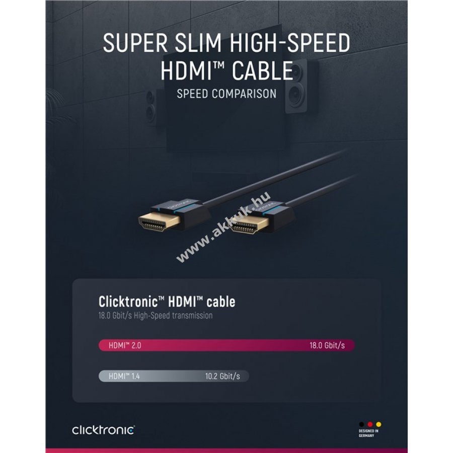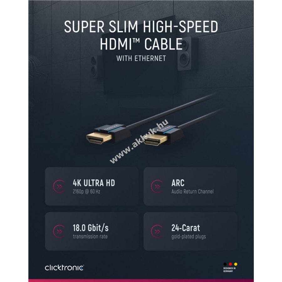 A Clicktronic Ultra-Slim HDMI kábel kiváló minőségű anyagokból készült és 10 év garanciával rendelkezik. A háromrészes PVC és ABS csatlakozó szerkezet megvédi a kábelt a töréstől. A 24 karátos aranyozott csatlakozók és tiszta réz vezetők biztosítják a tökéletes hang- és képátvitelt. Ideális otthoni mozizáshoz és játékhoz.