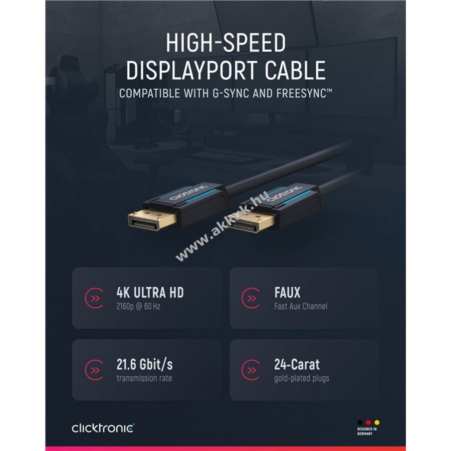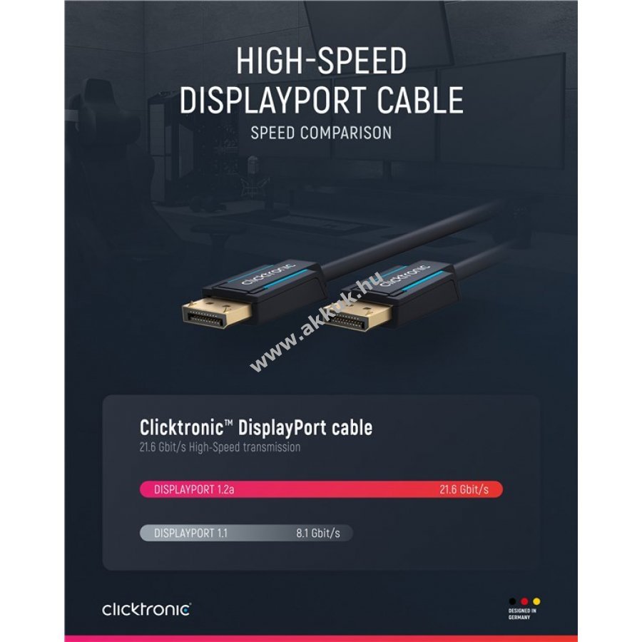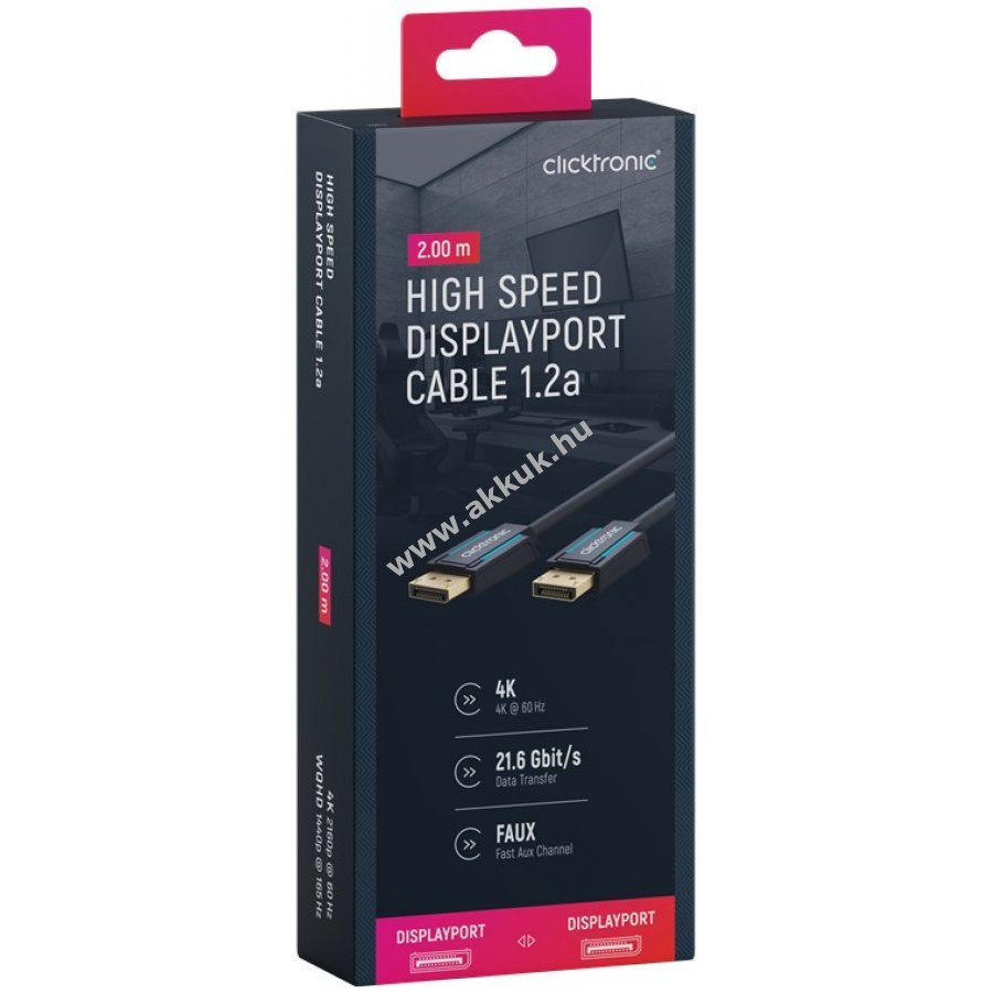 A Clicktronic DisplayPort kábel kiváló tartósságot és stabilitást biztosít 10 év garanciával. A háromrészes csatlakozó PVC és ABS anyagokból készült, amely megvédi a kábelt a hirtelen rántásoktól. 24 karátos aranyozott fém érintkezők és 99,9% oxigénmentes réz vezetők garantálják a kiváló hang- és képátvitelt. Ideális otthoni mozizáshoz és játékhoz.