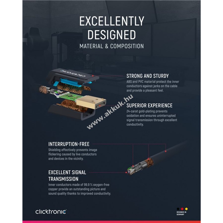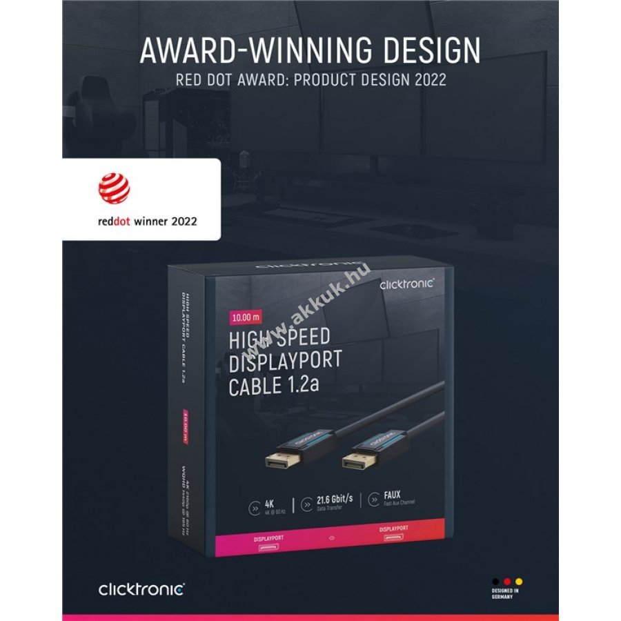 A Clicktronic DisplayPort kábel tartósságra és stabilitásra készült 10 év garanciával. A háromrészes PVC és ABS csatlakozóvédelem megóvja a kábelt a sérülésektől. A 24 karátos aranyozott fém érintkezők és 99,9% oxigénmentes réz vezetők kiváló hang- és képátvitelt biztosítanak. Támogatja a 4K 60 Hz és WQHD 60 Hz felbontást valamint G-Sync és FreeSync kompatibilis a játékhoz. Kettős árnyékolás és mechanikus csatlakozózár garantálja a megbízható kapcsolatot és gyors adatátvitelt 21,6 Gbit/s sebességgel.