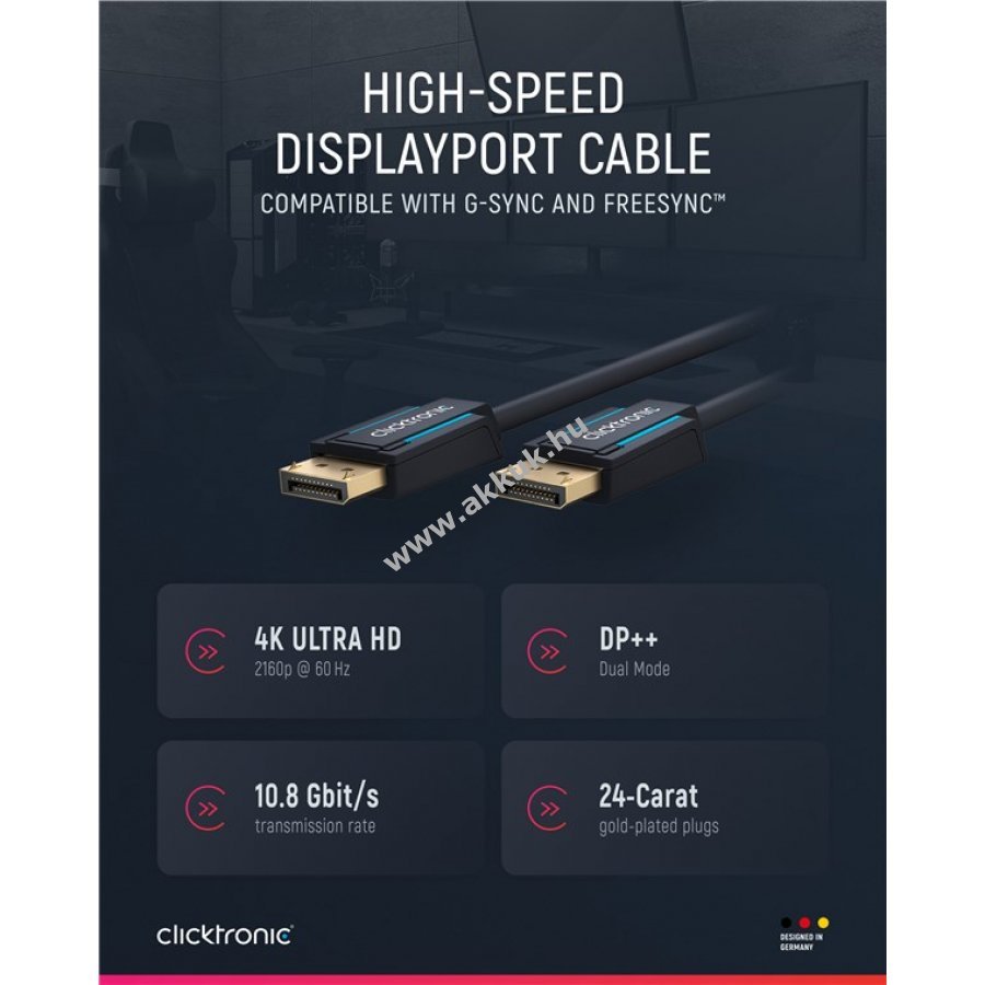 A Clicktronic DisplayPort kábel hosszú élettartamra és stabilitásra készült 10 év garanciával. A háromrészes PVC és ABS csatlakozó szerkezet védi a kábelt a hirtelen húzásoktól és törésektől. 24 karátos aranyozott csatlakozók és 99,9% oxigénmentes réz vezetők biztosítják a kiváló minőségű hang- és képátvitelt. Tökéletes választás otthoni mozihoz és játékhoz.