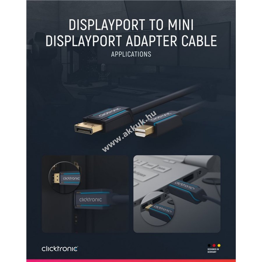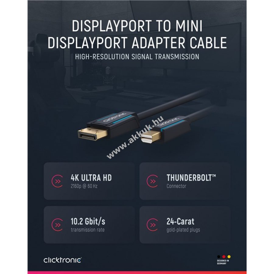 Clicktronic kábelek kiváló tartósságot és stabilitást kínálnak 10 év garanciával. A háromrészes PVC és ABS csatlakozó kialakítás védi a kábelt a töréstől. 24 karátos aranyozott csatlakozók és 99,9% oxigénmentes rézvezetők garantálják a kiváló hang- és képátvitelt. A kábel 4K 60 Hz felbontást és 10,2 Gbit/s sebességet támogat.