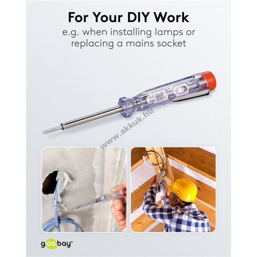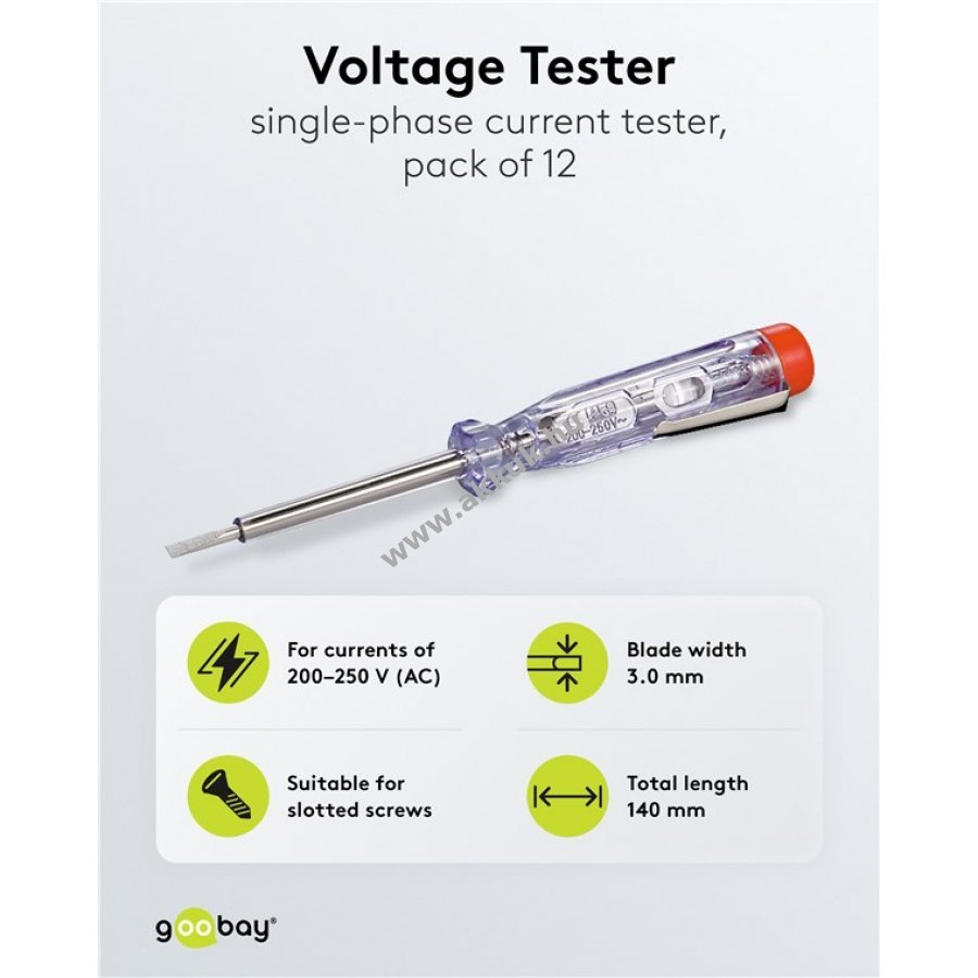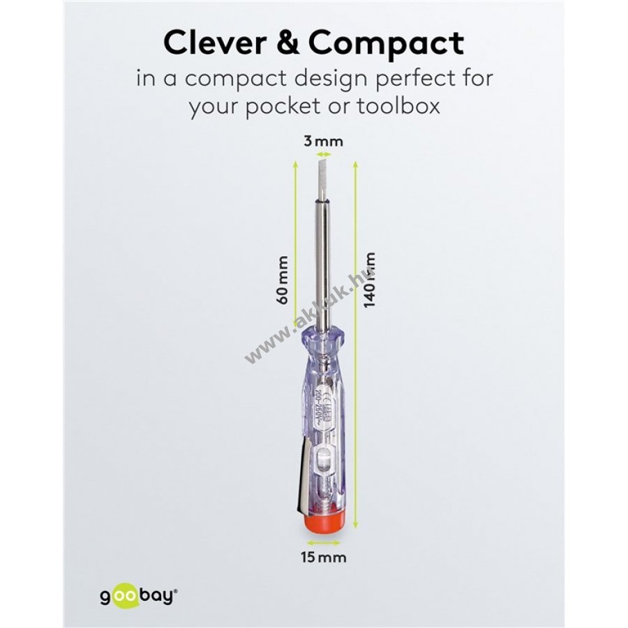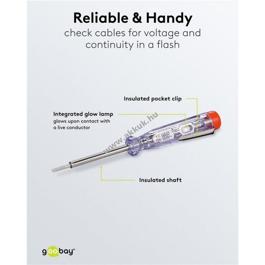 Könnyen használható feszültségvizsgáló eszköz elektromos csatlakozások gyors ellenőrzéséhez. Beépített jelzőizzó világít, ha áram alatt lévő vezetőhöz érintkezik. Egypólusú feszültségvizsgáló szigetelt nyéllel 200 V és 250 V közötti váltóáramhoz. Méretek: penge szélessége 3,0 mm nyélhossz 60 mm. Zsebklipsszel felszerelt. Használható csavarhúzóként is.