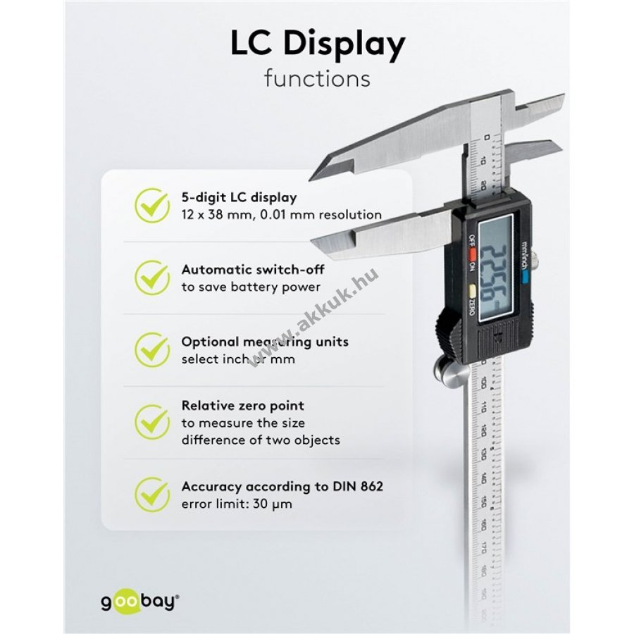- Nagy, 5 számjegyű LCD kijelző 12 x 38 mm méretben 0,01 mm / 0,0005 hüvelyk felbontással