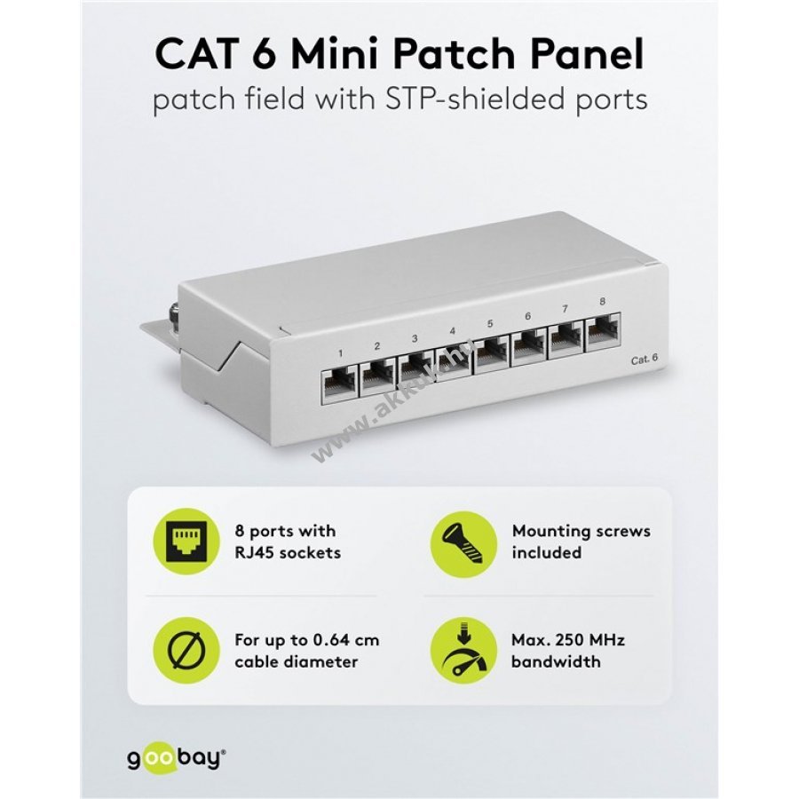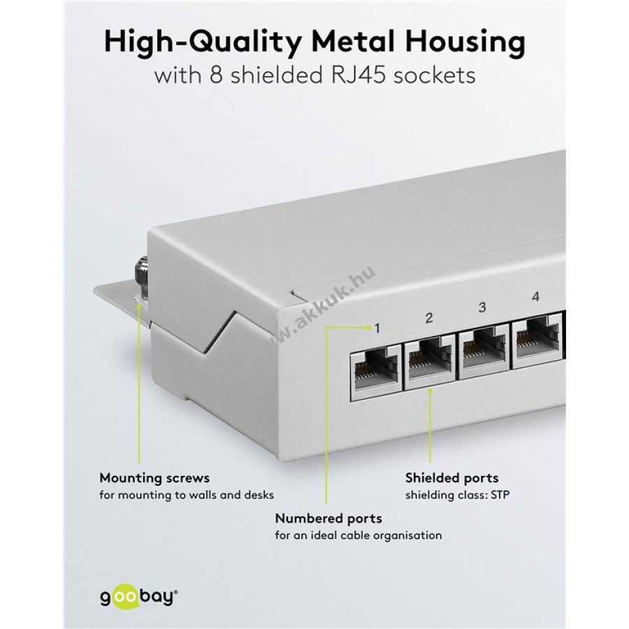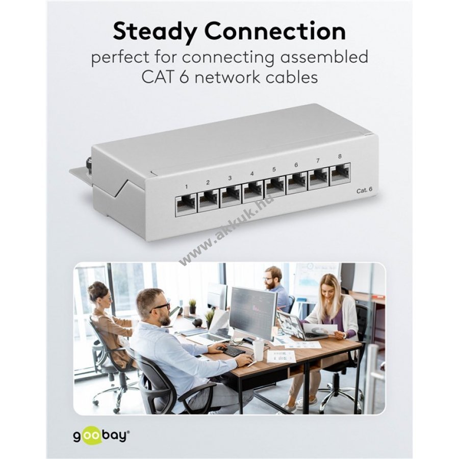 Masszív fém házzal és árnyékolt csatlakozókkal a kiváló kapcsolatért. 8 porttal a CAT-6 hálózati kábelek egyszerű csatlakoztatásához. Könnyű, szerszám nélküli LSA szerelés forrasztás, csavar vagy szigeteléscsupaszolás nélkül. A patch panel tartalmazza a falra és asztalra szereléshez szükséges csavarokat. Támogatja az AWG 22-26 kábelvastagságot 0,64 mm átmérőig. Az árnyékolt portok könnyen nyithatóak csavarok és szerszám nélkül. Számozott portok a rendezett kábelkezeléshez. Színkódolt csatlakozófelület a TIA 568 A/B szabvány szerint a helyes bekötéshez.
