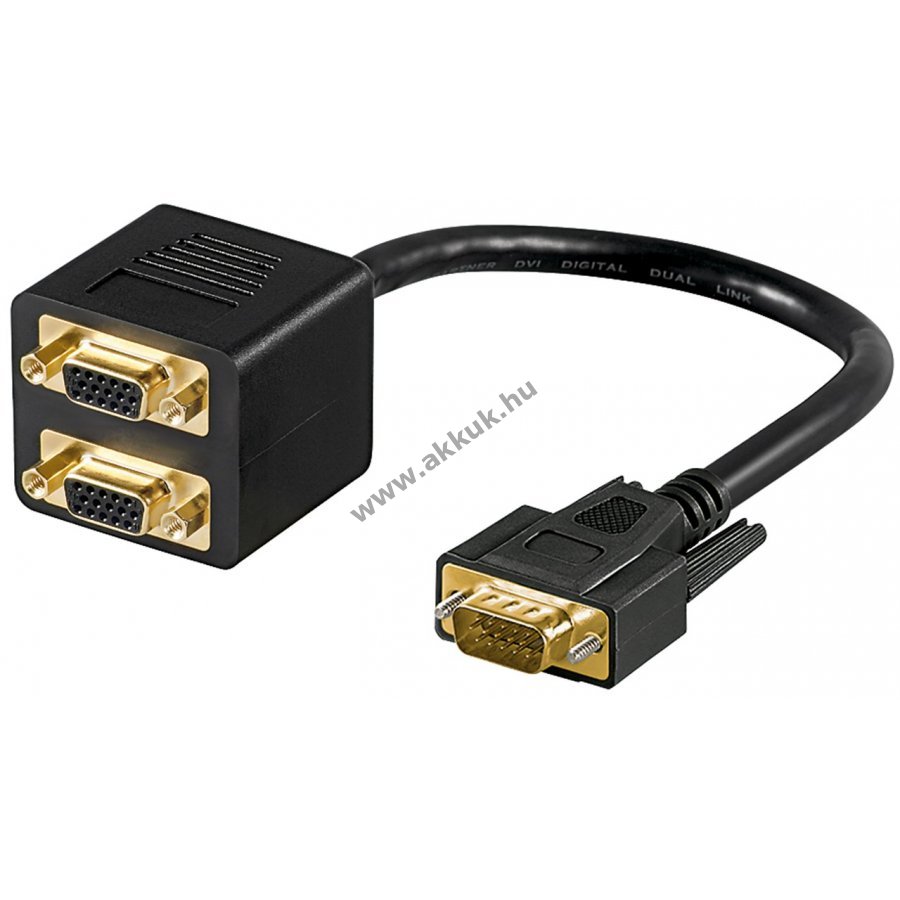 VGA elosztó kábel egy PC vagy laptop képjelének digitális továbbításához két VGA csatlakozású monitorra vagy projektorra meglévő VGA kábeleken keresztül Kompakt kialakítás szűk helyeken is használható Stabil PVC burkolat és törésvédő a csatlakozón megakadályozza a kábel sérülését Aranyozott korrózióálló csatlakozók hosszú távú kiváló vezetőképességet biztosítanak A VGA dugók ujjcsavaros rögzítéssel biztonságosan csatlakoztathatók