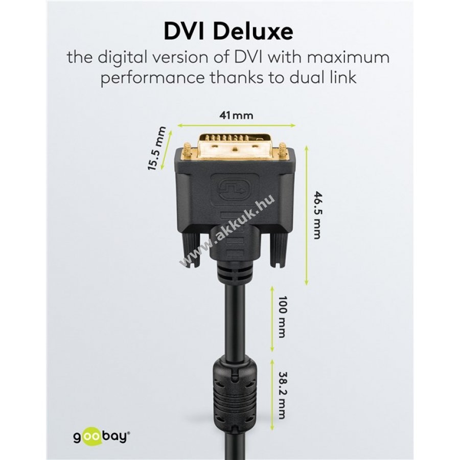 Goobay DVI-D kábel Dual-Link 24+1 tűvel digitális képátvitelhez PC-ről monitorra vagy projektorra. Támogatja a Full HD 1080p felbontást és akár WQXGA 2560x1600 pixelt. Az aranyozott csatlakozók korrózióállóak és hosszú távon biztosítják a kiváló vezetőképességet. Ferritgyűrűk mindkét végén hatékonyan csökkentik az elektromágneses zavarokat. A 1,8 m hosszúság ideális rövid távolságok áthidalására.