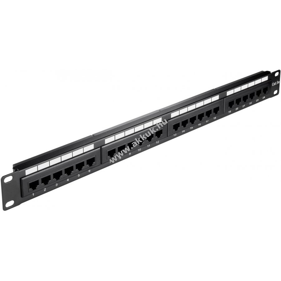Masszív fém házzal rendelkező patch panel 24 RJ45 porttal CAT 5e UTP kábelekhez 19 hüvelykes (48,3 cm) rackbe szereléshez.