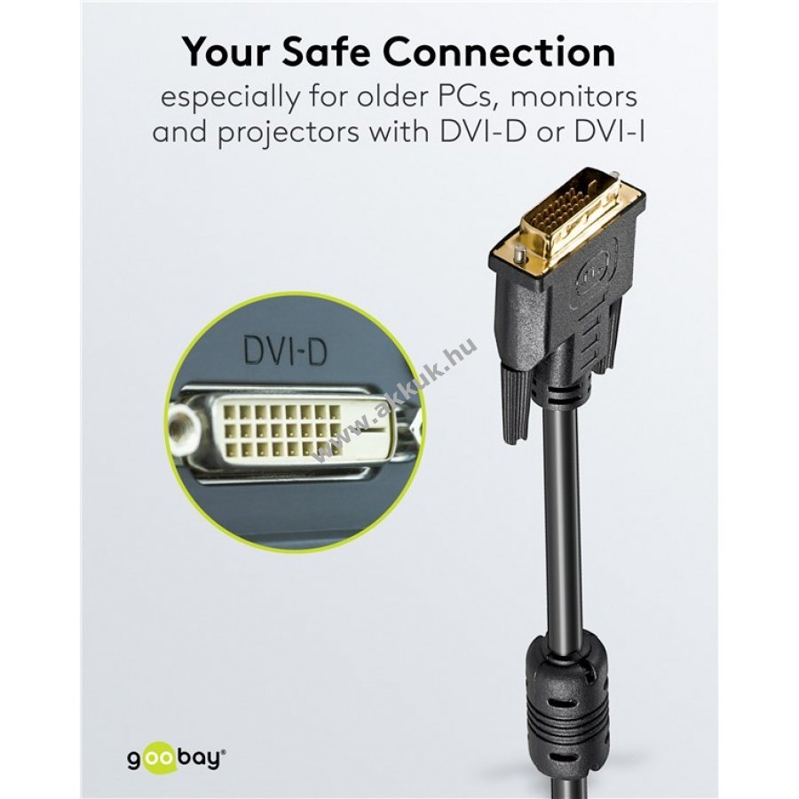 Digitális képátvitel PC-ről monitorra vagy projektorra DVI Dual Link (24+1 tű) csatlakozóval. Alkalmas notebookok, asztali számítógépek, kijelzők, CRT monitorok és projektorok csatlakoztatására. Támogatja a Full HD 1080p (1920 x 1080 pixel) és akár WQXGA (2560 x 1600 pixel) felbontásokat. Aranyozott, korrózióálló csatlakozók hosszú távú megbízhatóságot biztosítanak. Ferritmagok mindkét oldalon csökkentik az elektromágneses interferenciát. 15 m hosszúság ideális nagy távolságok áthidalására.