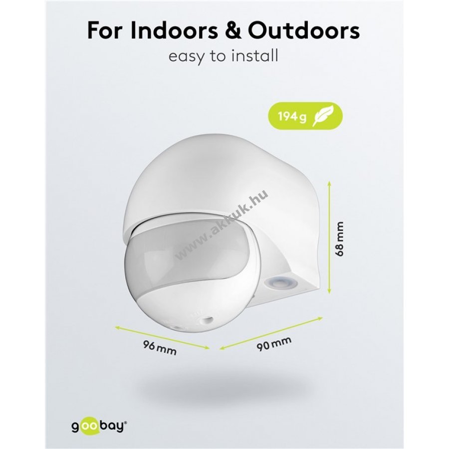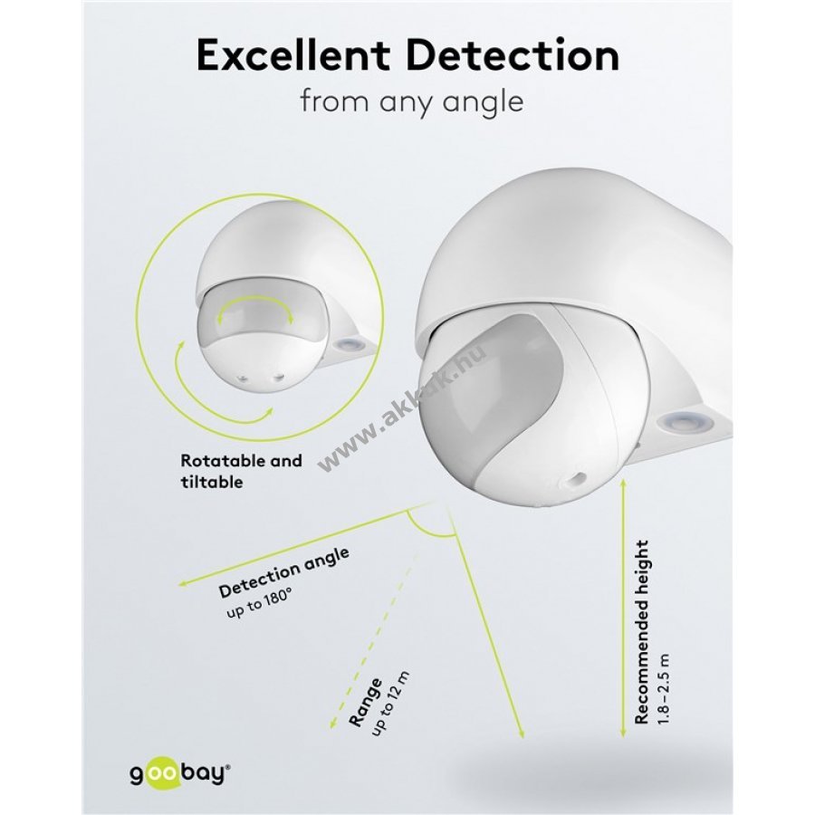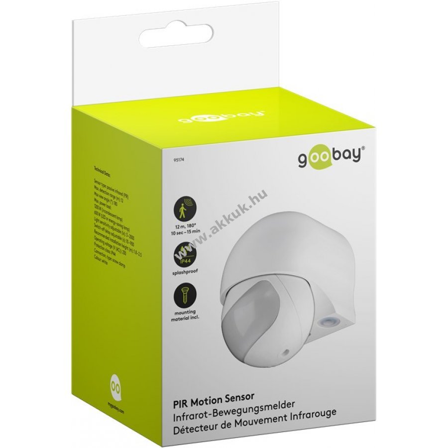 Kültéri használatra alkalmas mozgásérzékelő 180 fokos látószöggel és 12 m hatótávolsággal.