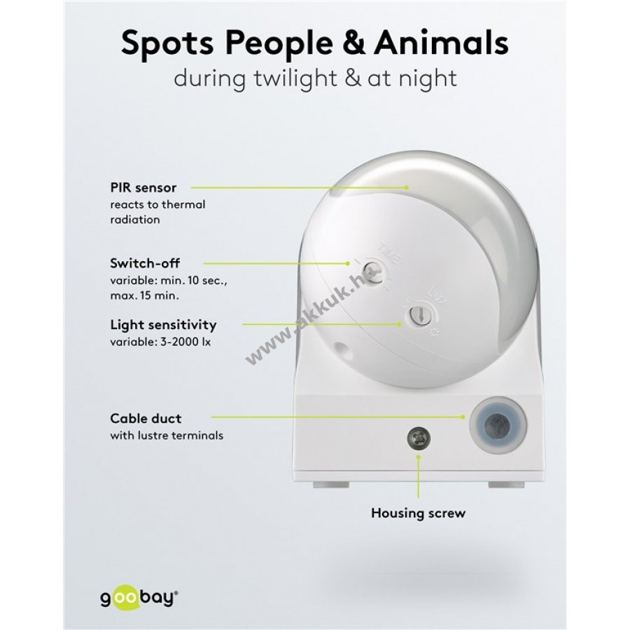 Állítható érzékenység 3 lx és 2000 lx között valamint kikapcsolási késleltetés 10 s és 15 perc között.