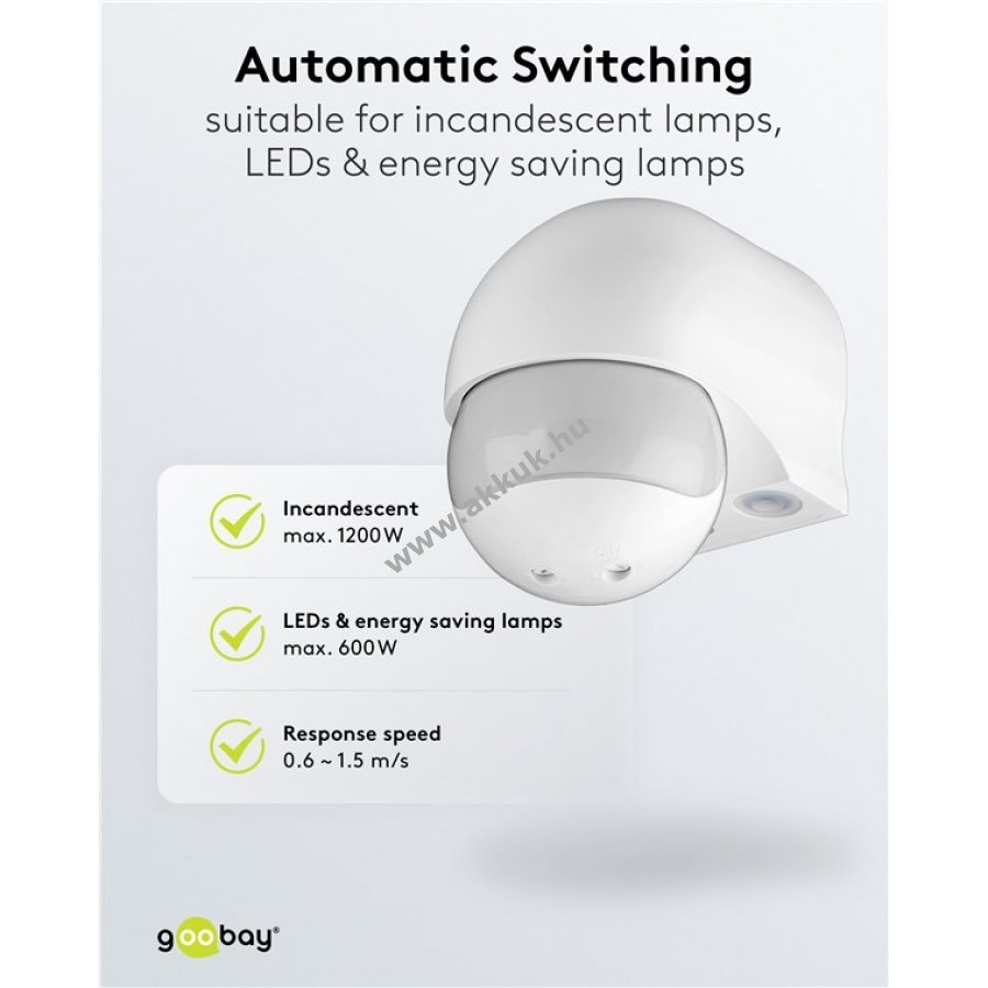 Kompatibilis LED és energiatakarékos lámpákkal 600 W-ig és hagyományos izzókkal 1200 W-ig.