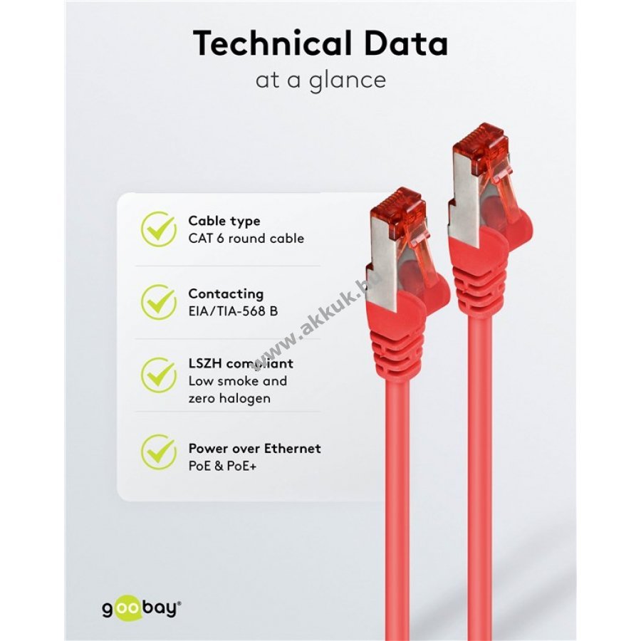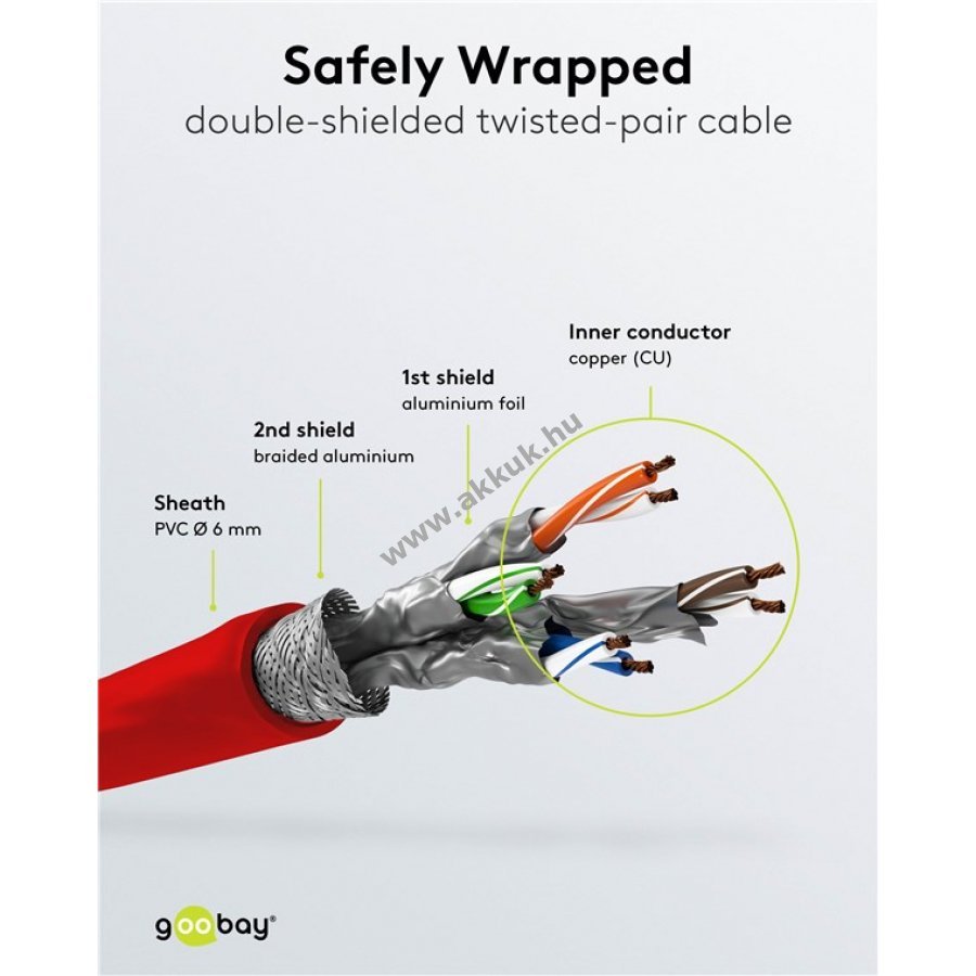 Kiváló minőségű CAT 6 kábel stabil és gyors hálózati kapcsolatot biztosít akár 10/100/1000 Mbit/s sebességgel. Kettős árnyékolású S/FTP kialakítás egyedi alumínium fólia szigeteléssel és külső alumínium fonott árnyékolással. Fém érintkezős, kupferkaschierter alumínium vezető (CCA) és aranyozott csatlakozók garantálják a megbízható jelátvitelt. Strapabíró PVC burkolat és hajlításvédő biztosítja a kábel hosszú élettartamát. Az RJ45 csatlakozó reteszvédelme megakadályozza a sérülést és a véletlen kihúzást. A kábel hossza a hajlításvédőn jól látható.