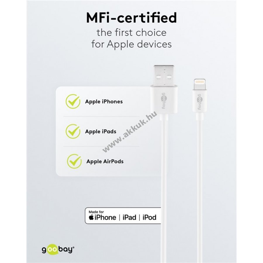 Kompatibilis Apple iPhone és iPad modellekkel valamint AirPods készülékekkel MFi tanúsítvánnyal. 480 Mbit/s sebességű adatátvitelt biztosít. USB-A csatlakozóról Lightning csatlakozóra gyors töltést és adat szinkronizálást tesz lehetővé. 2 m hosszú, rugalmas kábel, ideális rövidebb távolságok áthidalására például autóban. A csatlakozók védőtok használata mellett is könnyen csatlakoztathatók. Mindkét csatlakozónál törés elleni védelemmel a hosszú élettartam érdekében.