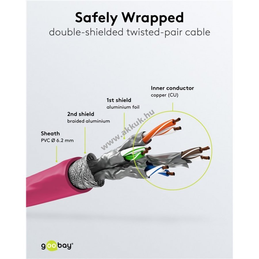 S/FTP árnyékolás alumínium fólia és fonott réteg kombinációjával védi a jelet. 50µ aranyozott érintkezők és tiszta réz vezető garantálják a megbízható kapcsolatot.