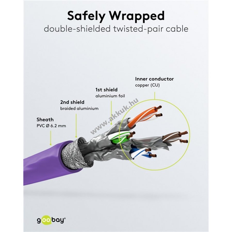 S/FTP teljes árnyékolás: alumínium fólia az egyes érpárokhoz (PiMF) és alumínium fonat a kábelburkolaton.