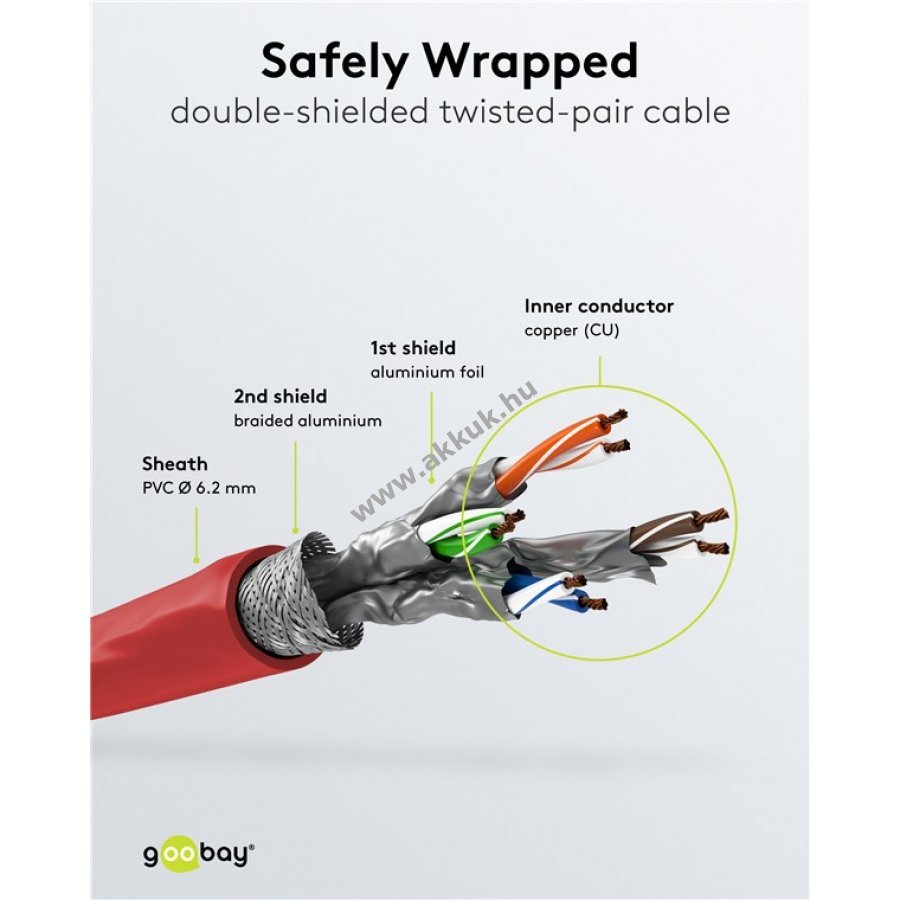 A kábel dupla árnyékolású S/FTP kialakítású alumínium fólia és fonott árnyékolással.