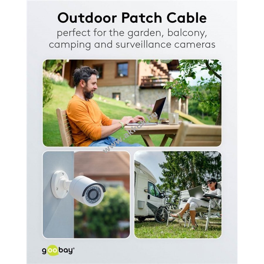 A Goobay CAT 6 kültéri patchkábel kiválóan alkalmas kültéri telepítésre például kertben kempingben épületfalakon erkélyen és megfigyelőkamerák csatlakoztatásához
