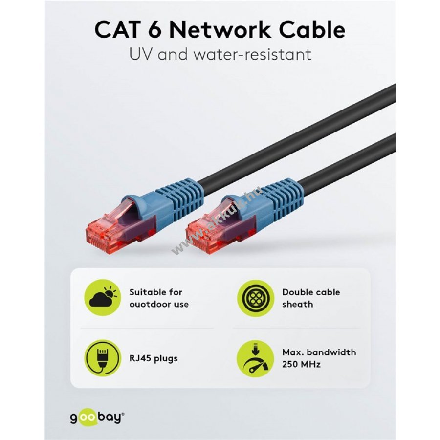 A Goobay CAT 6 kültéri hálózati kábel ideális kültéri használatra kertben kempingben épületfalakon erkélyen és megfigyelőkamerák csatlakoztatásához.