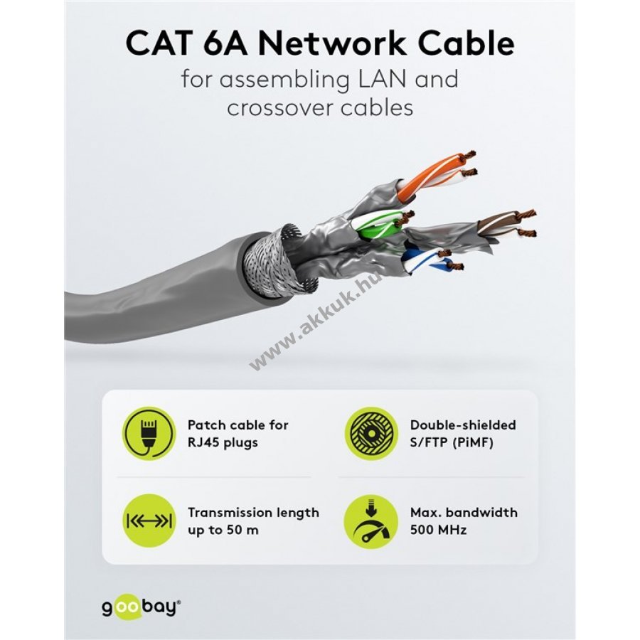 A Goobay CAT 6A kábel nagy sebességű stabil jelátvitelt biztosít kiváló minőségben mind otthoni mind irodai hálózatokhoz. Kiváló minőségű réz belső vezetőkkel és tartós kábelburkolattal rendelkezik.