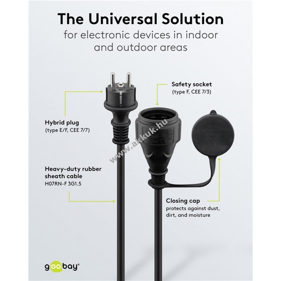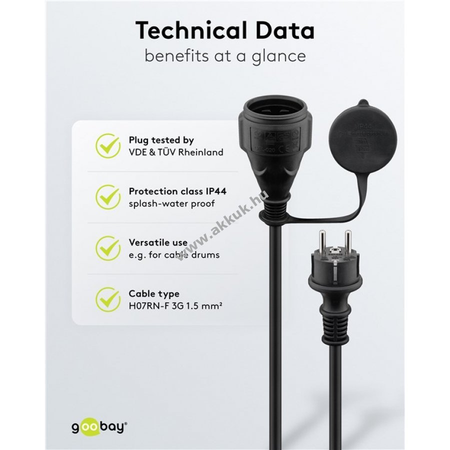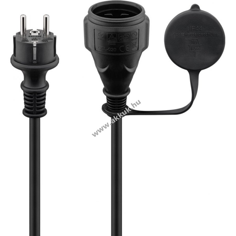 Kültéri és beltéri használatra alkalmas hálózati kábel 25 m hosszban. Tartós gumi külső borítás olaj-, hő- és hidegálló kivitelben. IP44 védelem vízpermet és nedves környezet ellen. Alkalmas háztartási gépek, például porszívó vagy fűnyíró hosszabbítására. VDE és TÜV Rheinland által minősített dugó 16 A, 250 V, 3680 W teljesítményig. A csatlakozó aljzaton védőkupak a por és nedvesség elleni védelemhez. Közepes mechanikai igénybevételre tervezett rugalmas kábel (H07RN-F 3G1,5).
