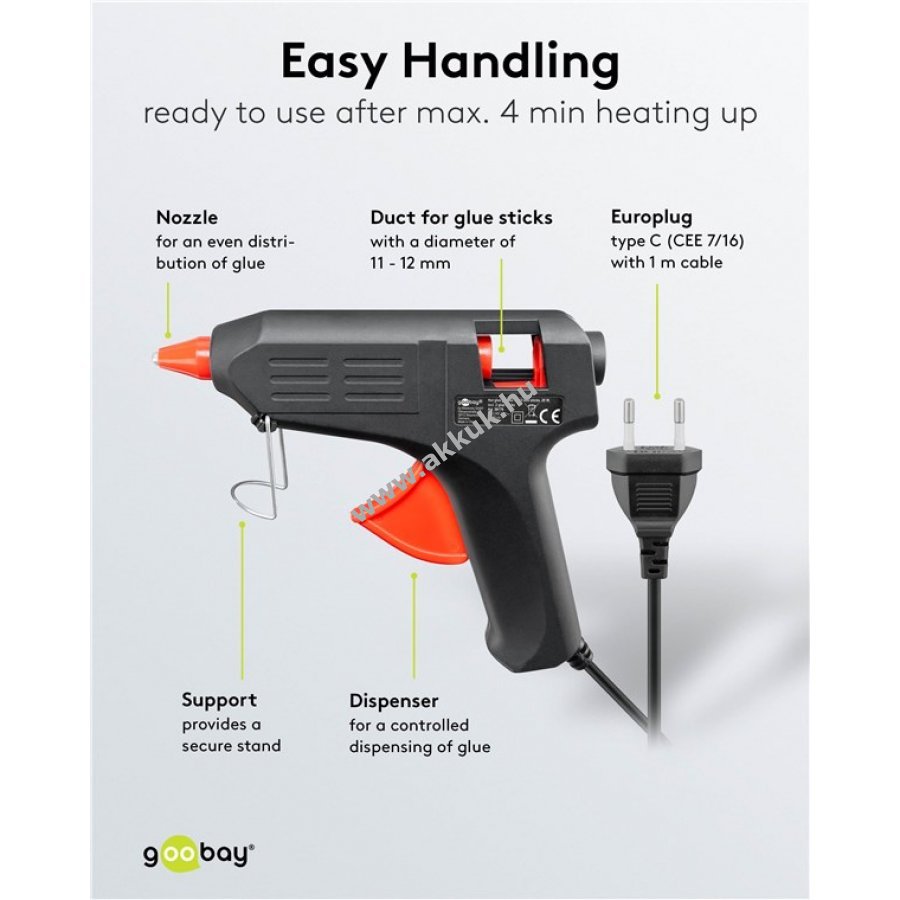 Tiszta ragasztás otthoni hobbi és barkács munkákhoz 20 W teljesítmény 11 mm és 12 mm ragasztórúdhoz Használatra kész legfeljebb 4 perc felmelegedés után Akár 16 g ragasztó felmelegítése percenként Sokoldalúan használható fa kerámia bőr üveg műanyag és textil ragasztására