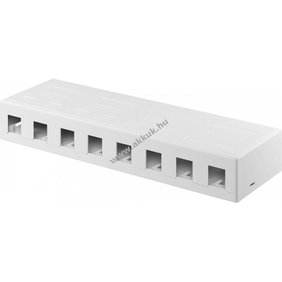 Üres elosztóház 8 darab Keystone modulhoz Snap-In szereléssel amelyeket például RJ45 aljzatokkal lehet felszerelni és előkészített hálózati kábelek csatlakoztatására alkalmas. Használható laborokban műhelyekben otthoni szórakoztató rendszerekben és hálózati telepítések során. Tartozék rögzítő csavarokkal falra és asztalra szereléshez. Portok 180 fokos kábelvezetővel.