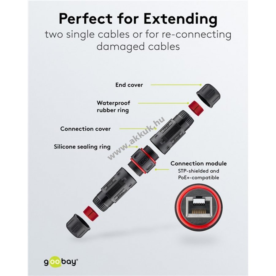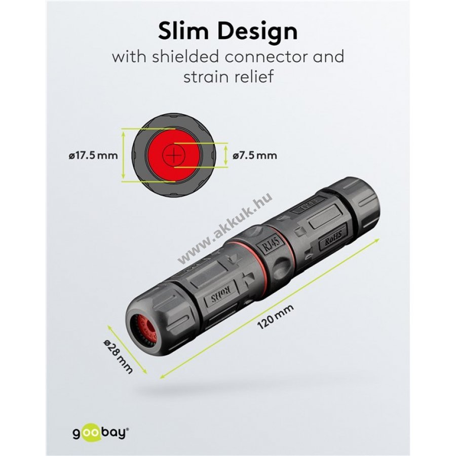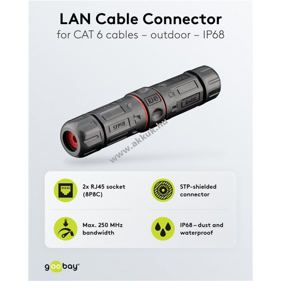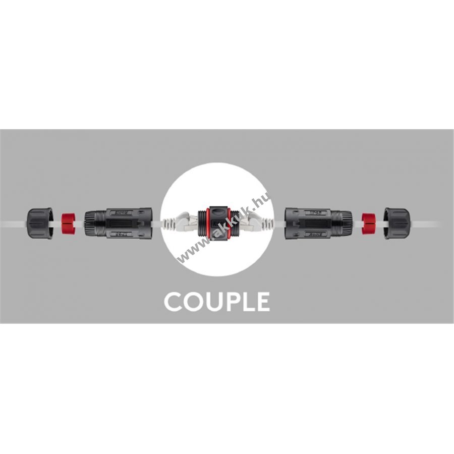 Kültéri és ipari használatra készült, por- és vízálló IP68 védettségű CAT6 kábelcsatlakozó. 8 érintkezős kábelek összekötésére, hosszabbítására vagy javítására alkalmas. Kompakt kialakításának köszönhetően szűk helyeken, például kábelcsatornákban is könnyen telepíthető. Árnyékolt (STP) a megbízható adatátvitel érdekében. 250 MHz maximális adatátviteli sebességet biztosít. Kompatibilis 4,0-8,0 mm átmérőjű patch kábelekkel. Támogatja a PoE+ (IEEE 802.3at) alkalmazásokat.