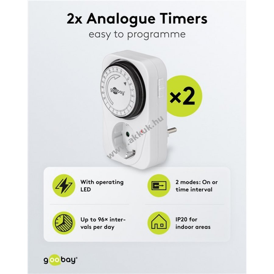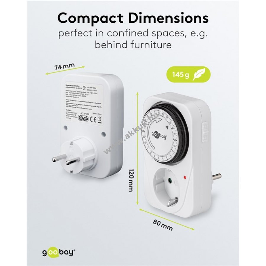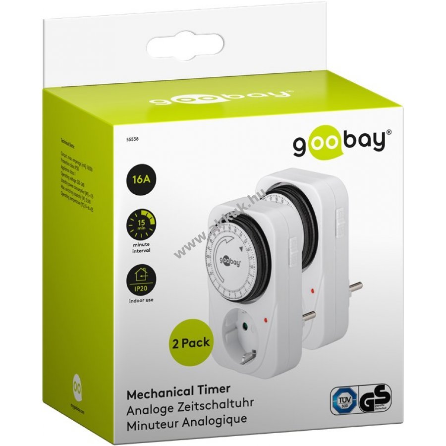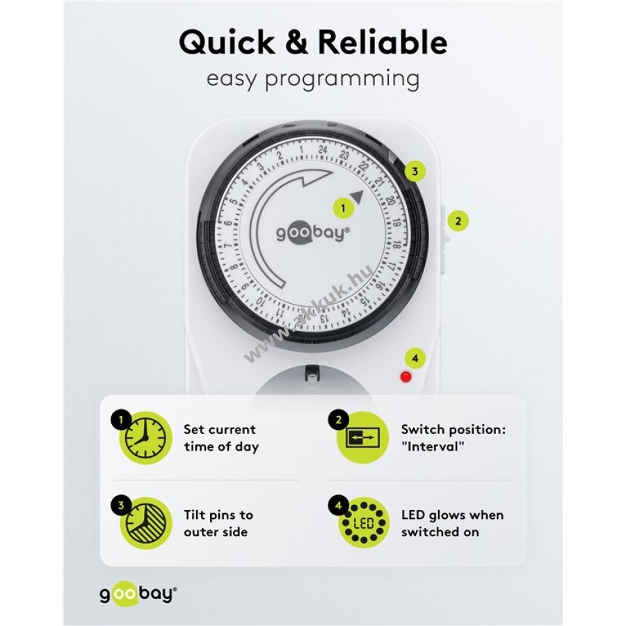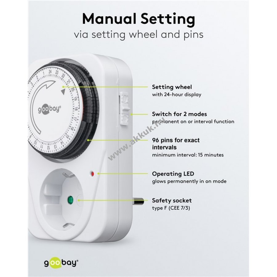 Analóg Goobay időkapcsoló konnektorhoz pontos vezérlést biztosít elektronikus eszközök számára. 15 perces lépésekben naponta akár 96 kapcsolást tesz lehetővé. Az időkapcsoló azonnal használatra kész beltéri védőérintkezős aljzatba dugva. Mechanikus kialakítás ideális akváriumvilágításhoz, redőnyhöz, keringetőszivattyúhoz, vízszivattyúhoz, zsaluziákhoz, terráriumhoz vagy karácsonyi fényekhez. Állapotjelző LED mutatja a működést. Oldalsó kapcsolóval folyamatos üzemmódra állítható.