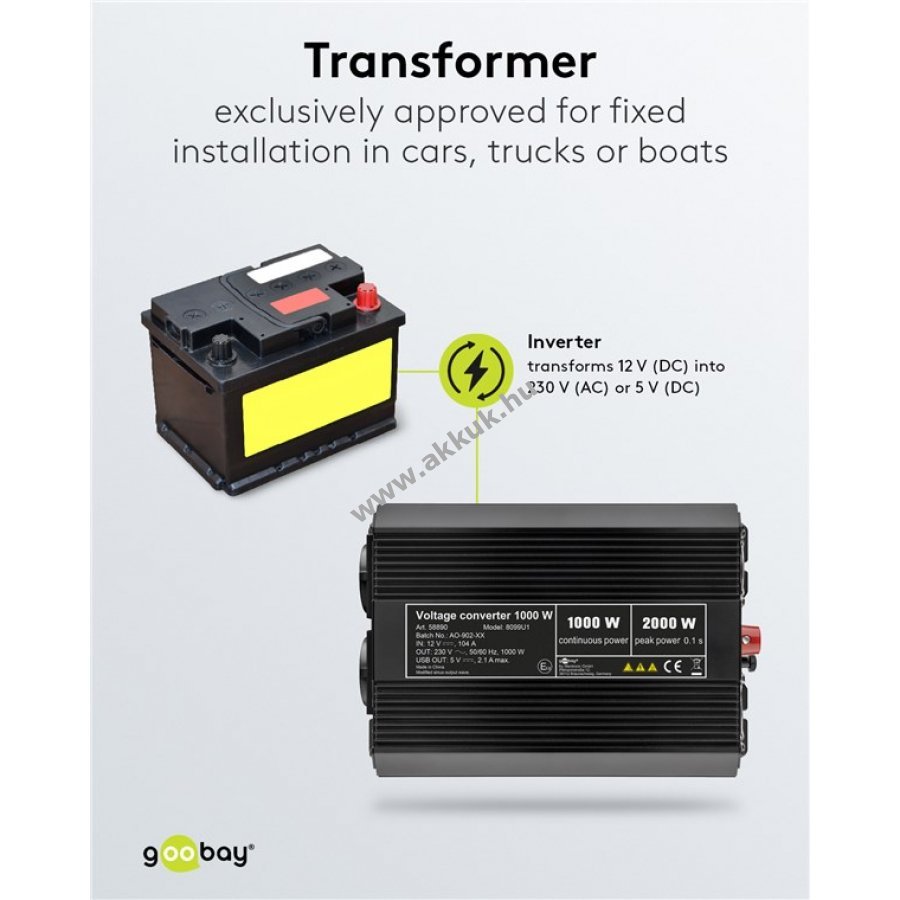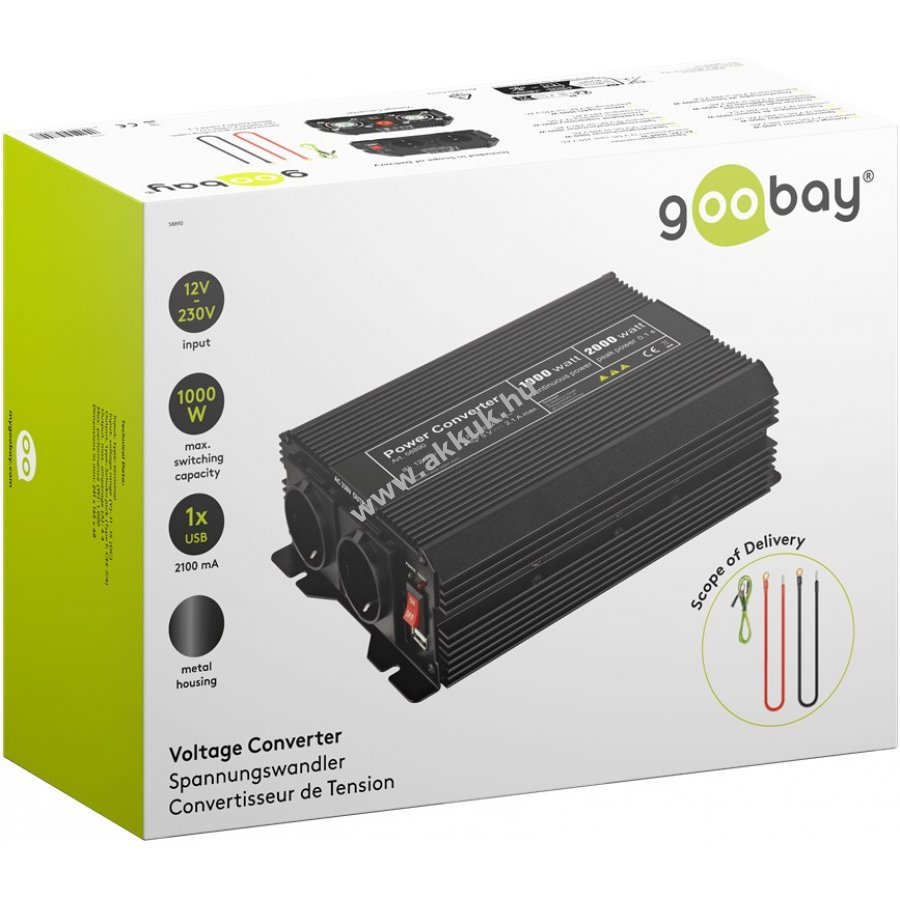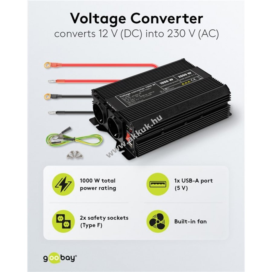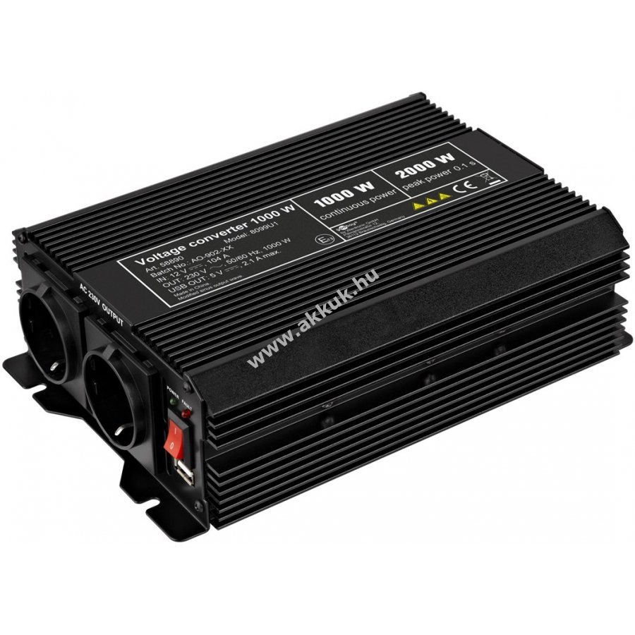 A konverter 1000 W folyamatos teljesítményt biztosít és 2000 W teljesítménycsúcsot képes elviselni 0,1 másodpercig.