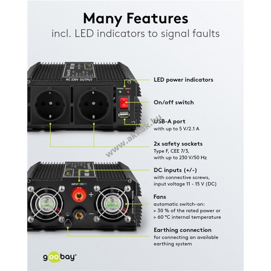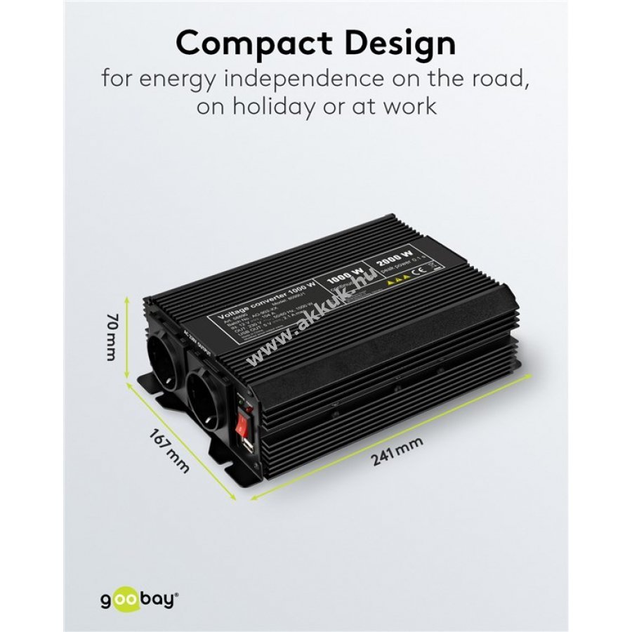 A feszültségátalakító megbízható áramellátást biztosít útközben, nyaraláskor, kempingezésnél vagy munkában. Az autó akkumulátorának energiáját 230 V-os háztartási készülékekhez és elektromos szerszámokhoz használhatja. A beépített USB csatlakozó mobil eszközök, például okostelefonok vagy laptopok töltésére alkalmas.