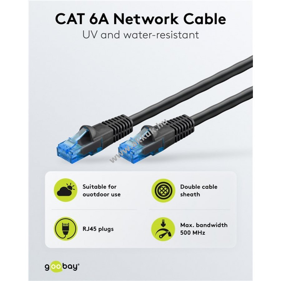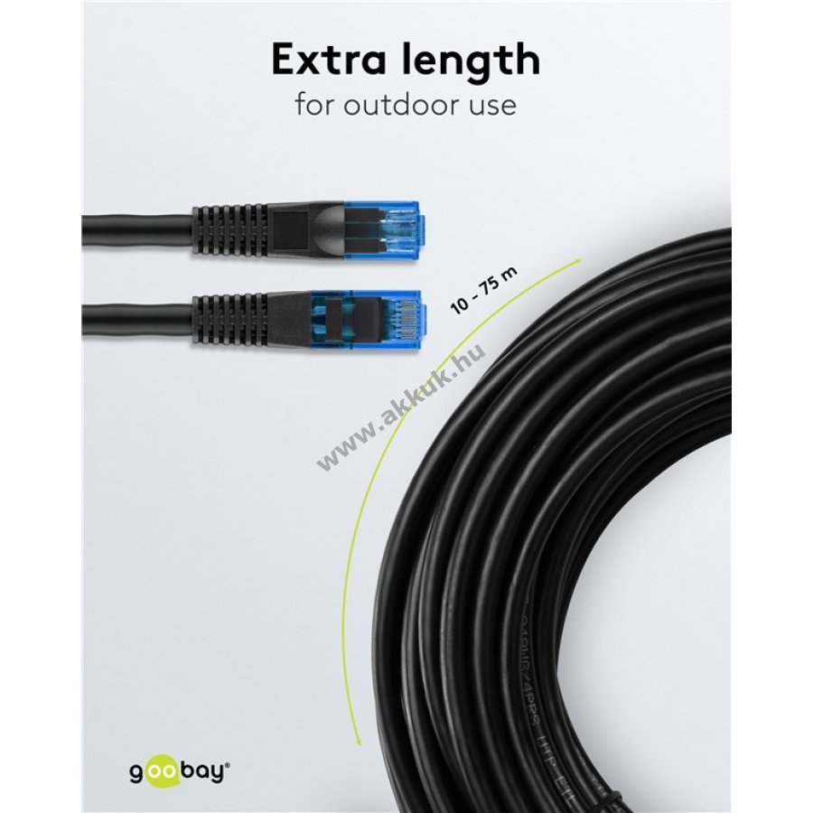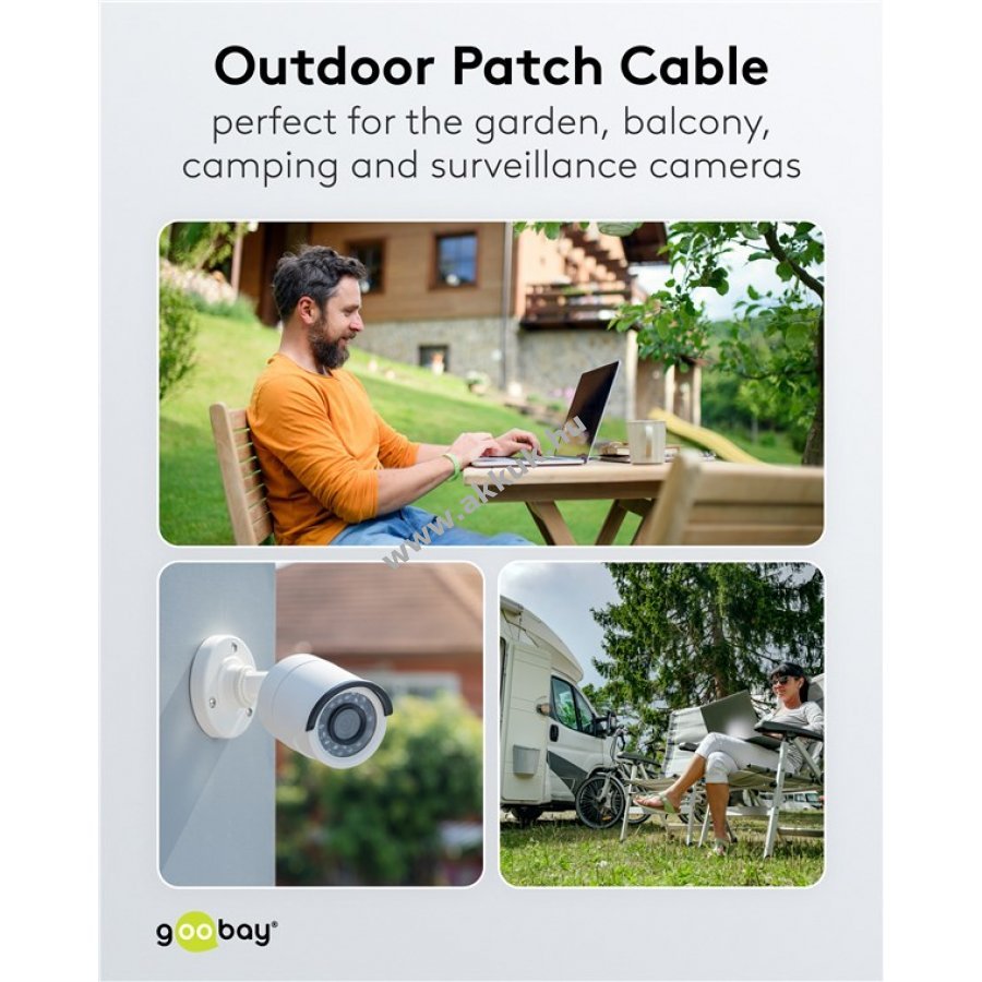 A Goobay CAT 6A kültéri hálózati kábel ideális kültéri használatra például kertben kempingezéshez épületfalakon erkélyeken és megfigyelőkamerák csatlakoztatásához