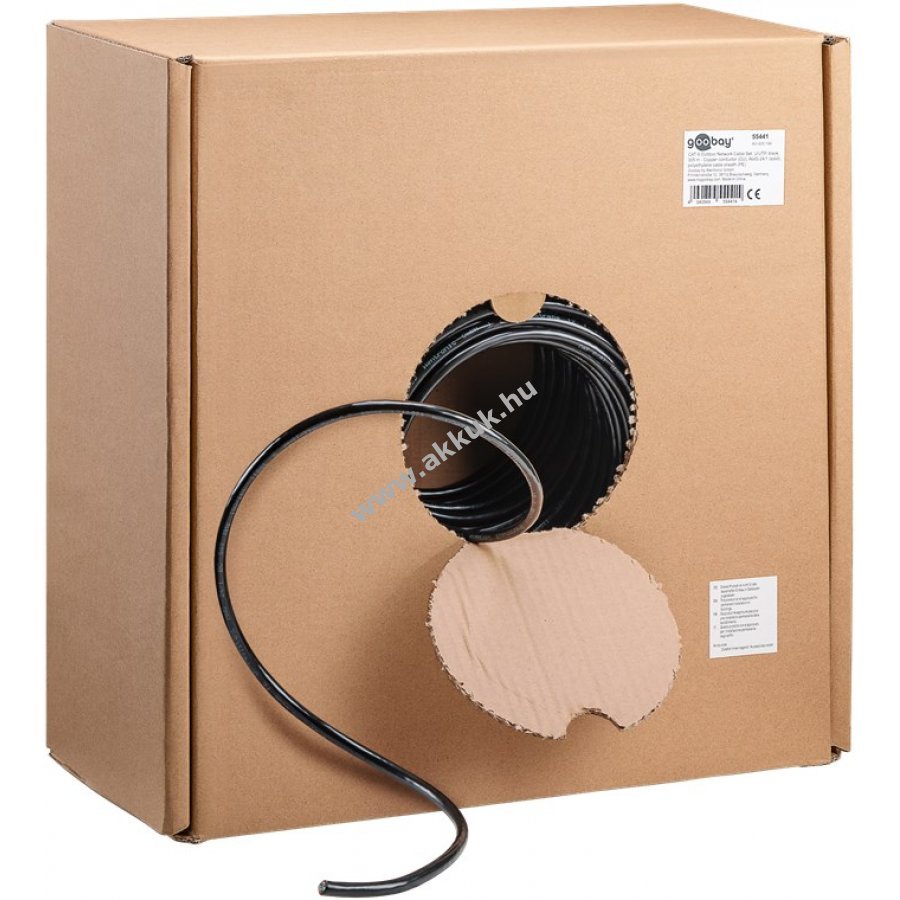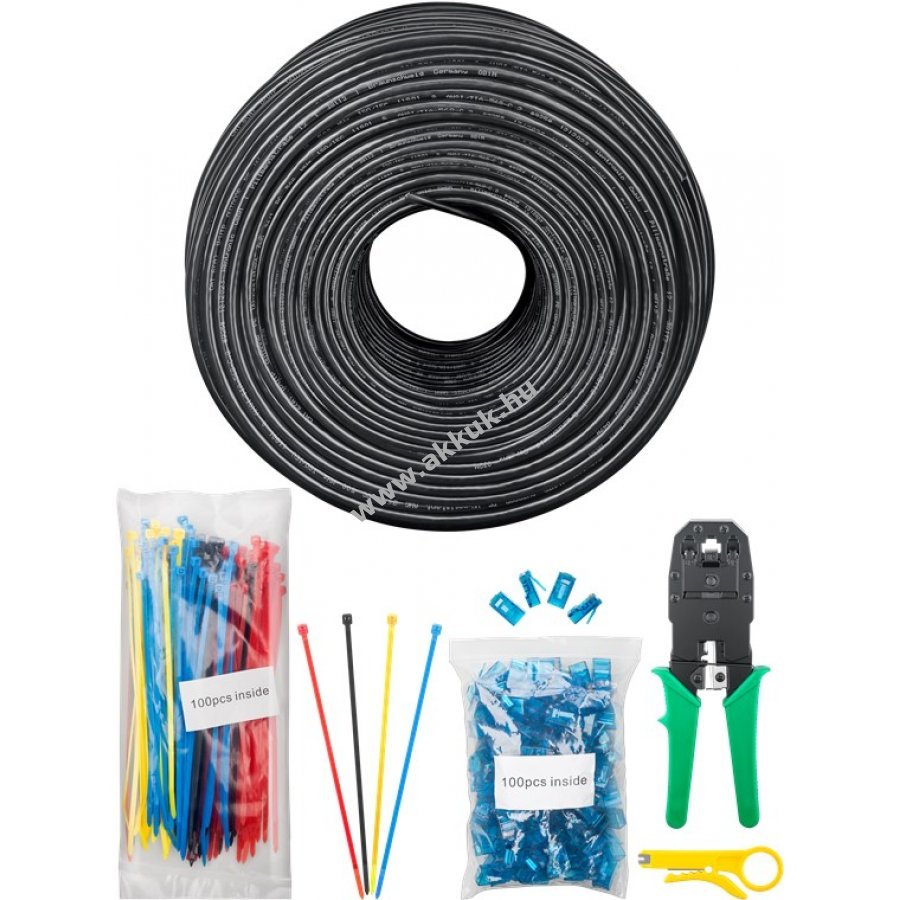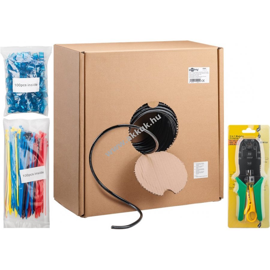 A Goobay CAT 6A kültéri hálózati kábel szett ideális kültéri telepítéshez kertben kempingben épületfalakon erkélyen és megfigyelő kamerákhoz A kettős polietilén külső burkolat ellenáll az időjárási hatásoknak és UV sugárzásnak A készlet tartalmaz 1x CAT 6A LAN kábelt 1x krimpelő fogót 100x színes kábelkötegelőt és 100x RJ45 csatlakozót A kábel árnyékolatlan UTP Twisted-Pair típusú maximális átviteli távolsága 70 m Kiváló minőségű réz vezető garantálja a megbízható hálózati kapcsolatot A kábel alkalmas Gigabit Ethernet 10 100 1000 10000 Mbit/s sebességre Nem alkalmas állandó épületen belüli beépítésre
