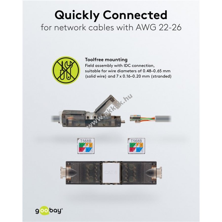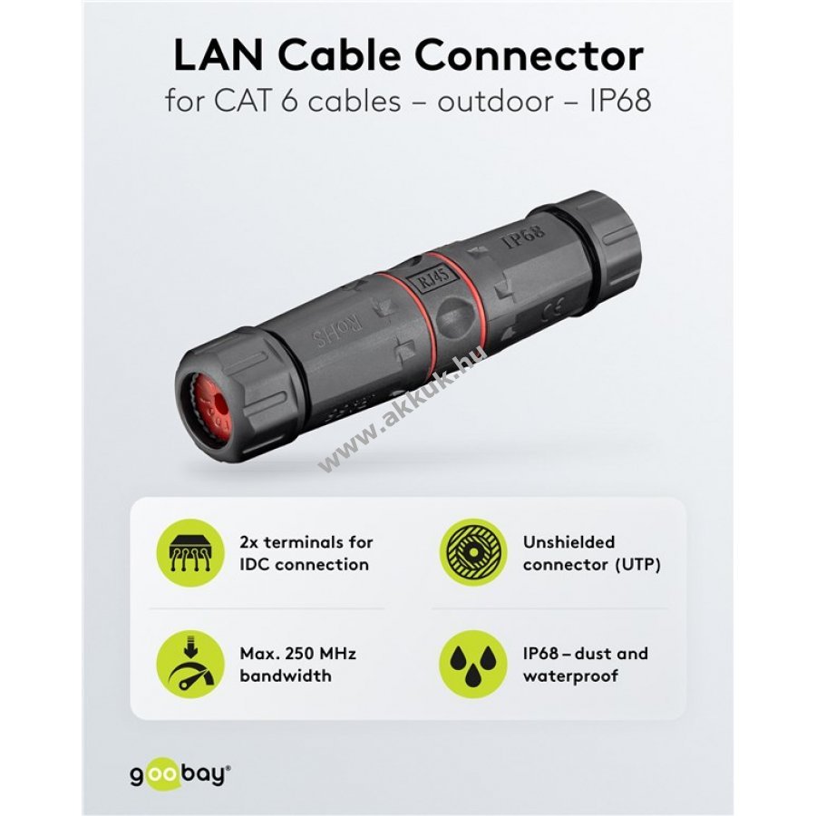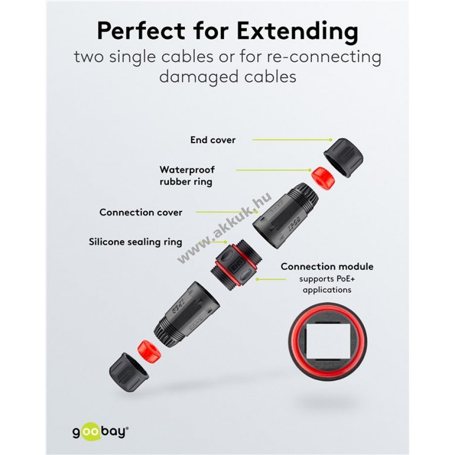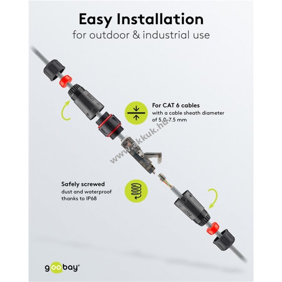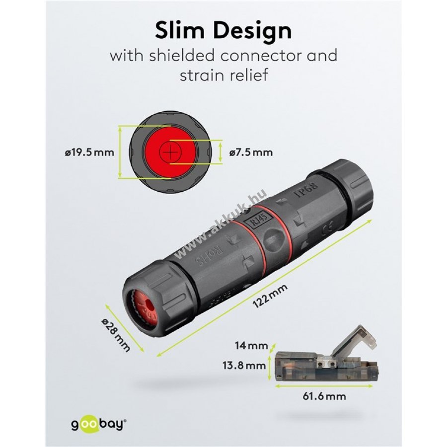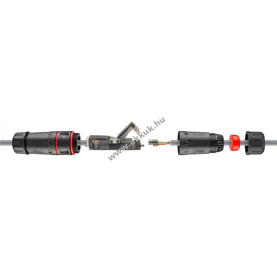 Védett hálózati kábelcsatlakozó kültéri és ipari használatra por- és vízálló IP68 védelemmel. 8-eres kábelek összekötésére, hosszabbítására vagy javítására alkalmas. Kompakt kialakítása lehetővé teszi a szűk helyeken, például kábelcsatornákban történő alkalmazást. Szerszám nélküli LSA csatlakozási technológiával szerelhető, nem igényel forrasztást vagy csavarozást. 500 MHz maximális adatátviteli sebességet biztosít kiváló hálózati teljesítményhez. Kompatibilis AWG 22-26 méretű, 5,0-7,5 mm átmérőjű kábelekkel. Vékony kialakítású modul árnyékoló csatlakozóval és beépített húzáscsillapítással.