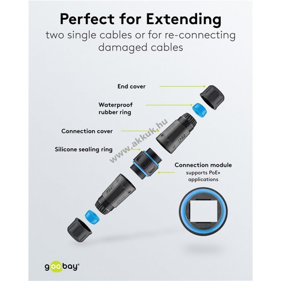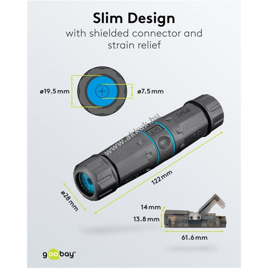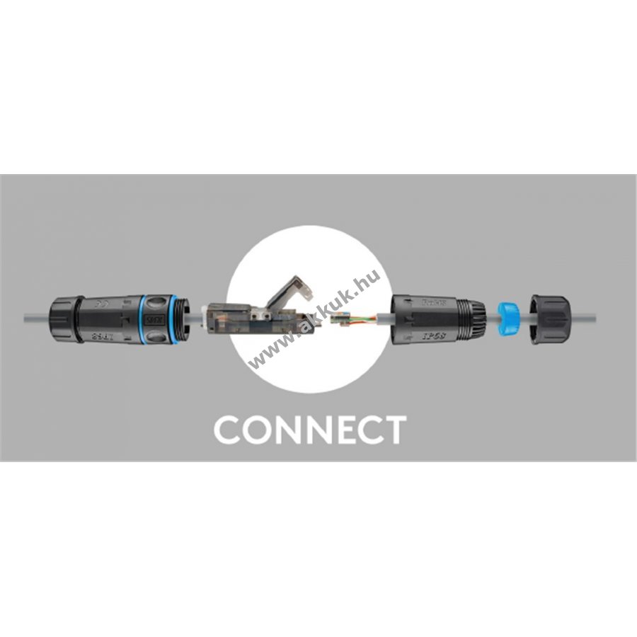 Az IP68 védettségű kábelcsatlakozó 8 eres adatkábelek összekötésére, hosszabbítására és javítására készült. Különösen alkalmas szűk helyeken, például kábelcsatornákban történő használatra a karcsú kialakításának köszönhetően.