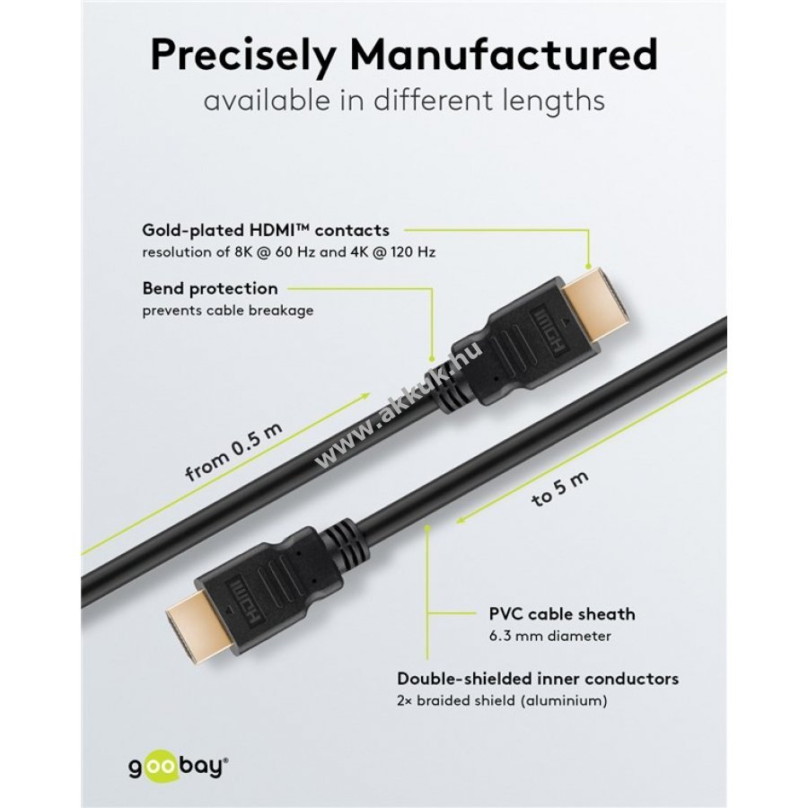 Prémium minőségű HDMI kábel 8K @ 60 Hz és 4K @ 120 Hz felbontás támogatásával valamint 48 Gbit/s adatátviteli sebességgel. Kiválóan alkalmas tévék, monitorok, projektorok, játékkonzolok és streaming eszközök csatlakoztatásához. Hivatalosan tesztelt és tanúsított az Ultra High-Speed HDMI program szerint a legmagasabb minőség és funkciók biztosítására.