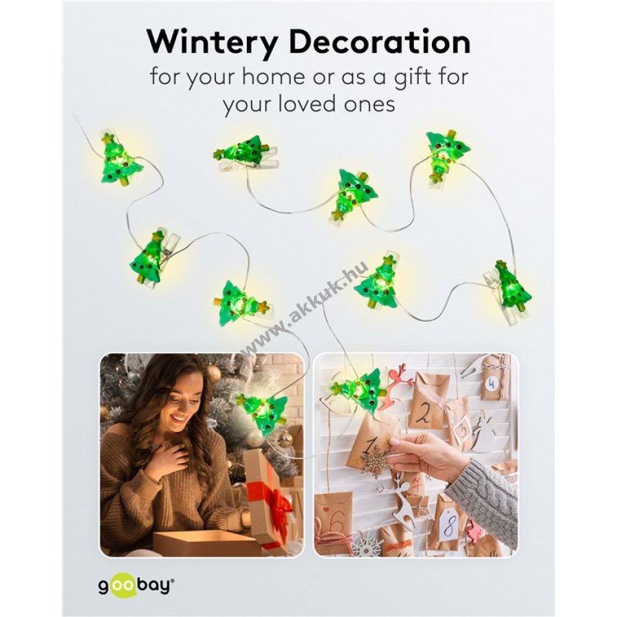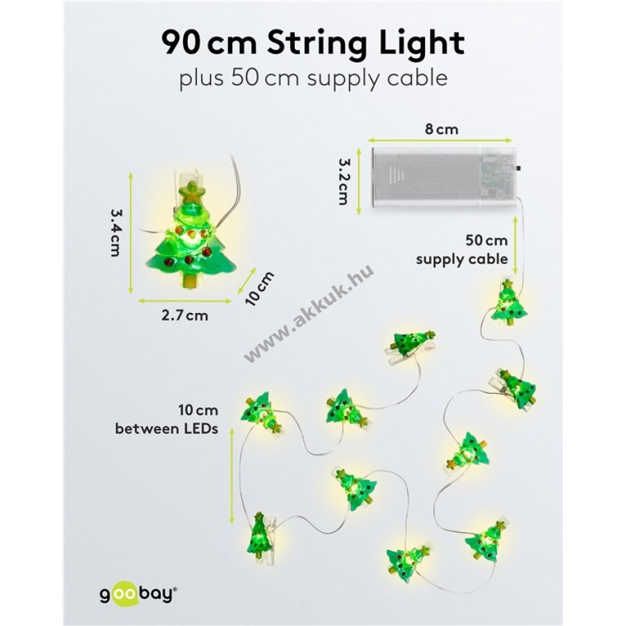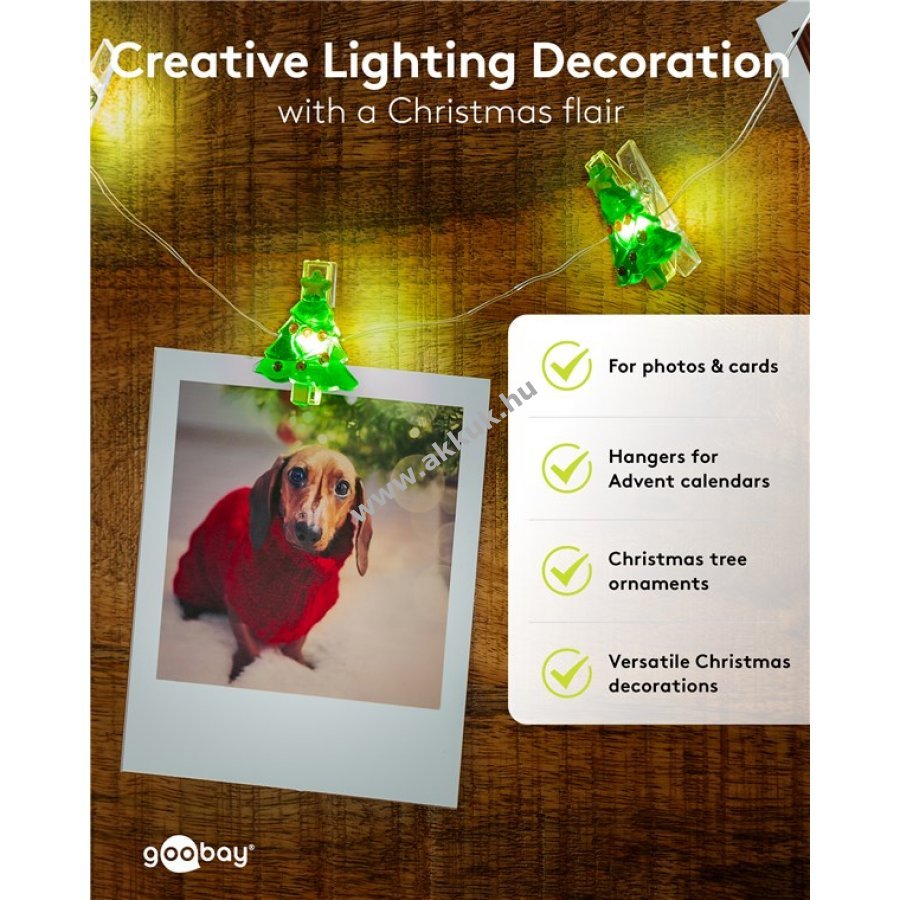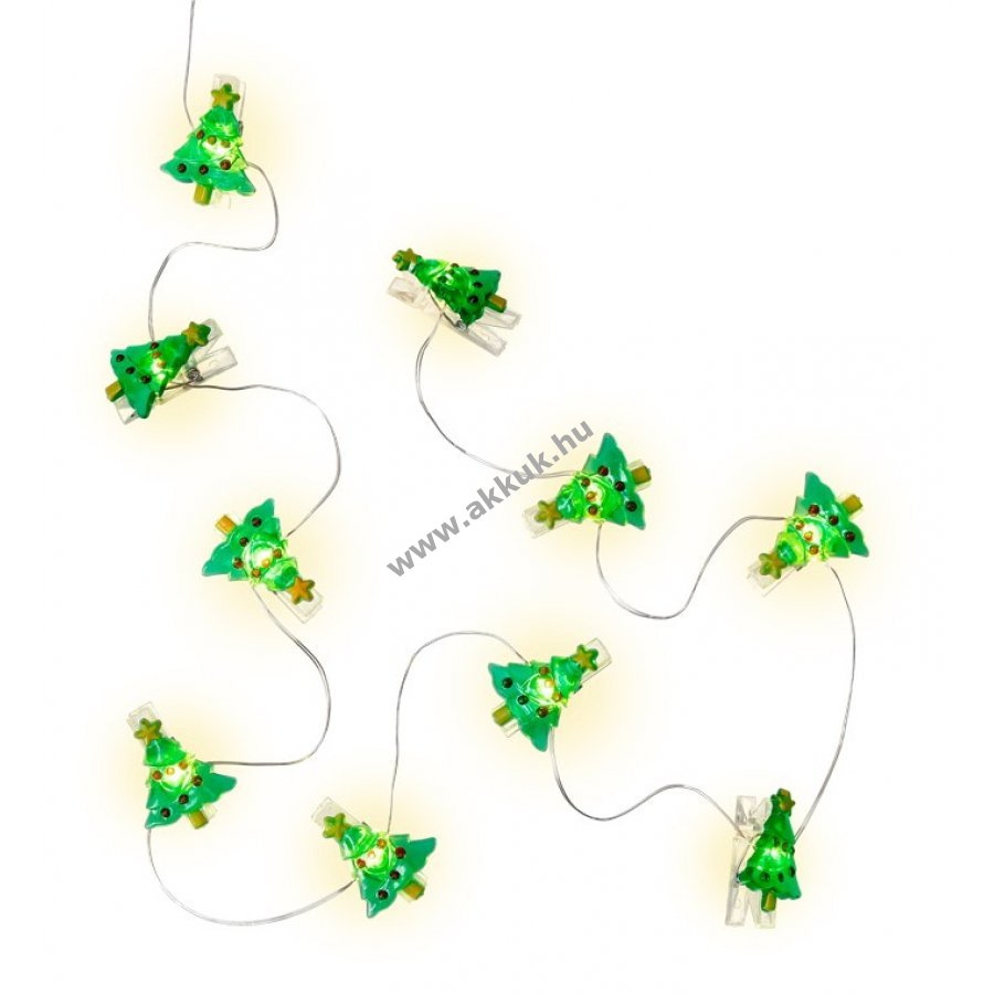 Teljes hossz 140 cm átlátszó tápkábel 50 cm LED-ek közötti távolság 10 cm hajlékony ezüst színű vezeték Világító fotóklipszek zöld karácsonyfa mintával Méret kb 3,4 x 2,7 cm