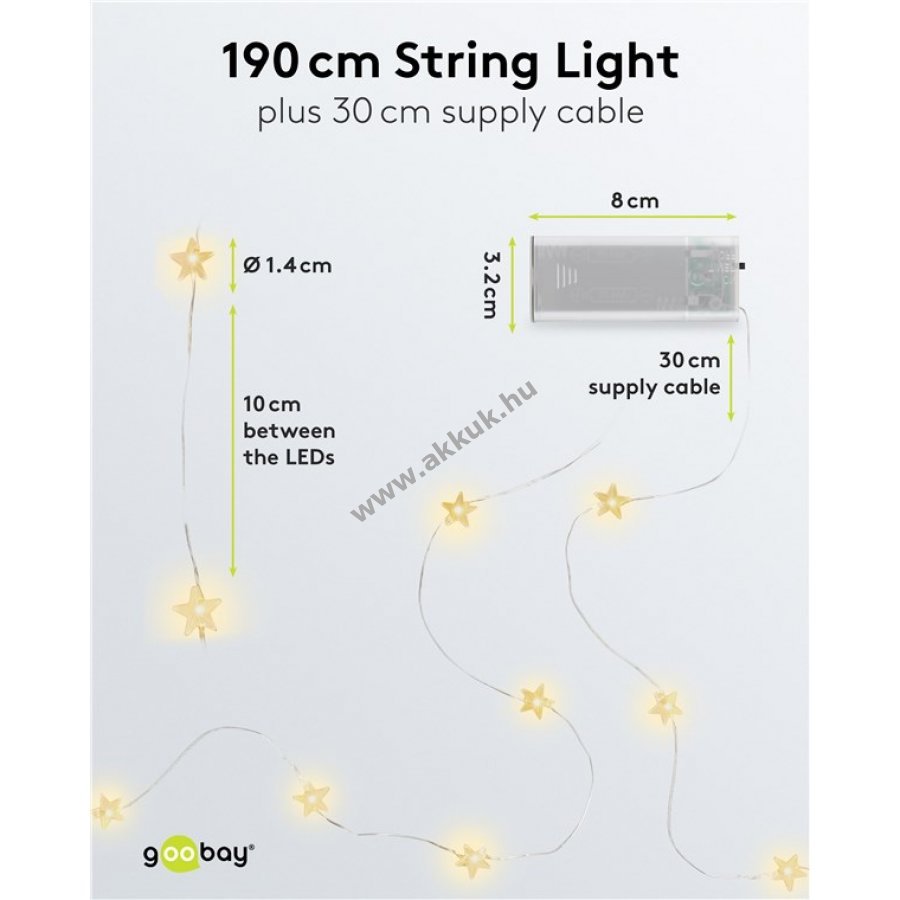 Teljes hossz 2,20 m, átlátszó tápvezeték 30 cm, LED-ek távolsága 10 cm, csillagok átmérője 1,4 cm, anyaga műanyag.