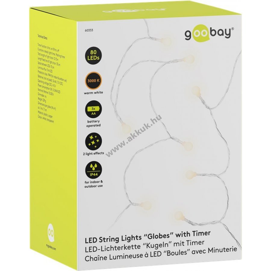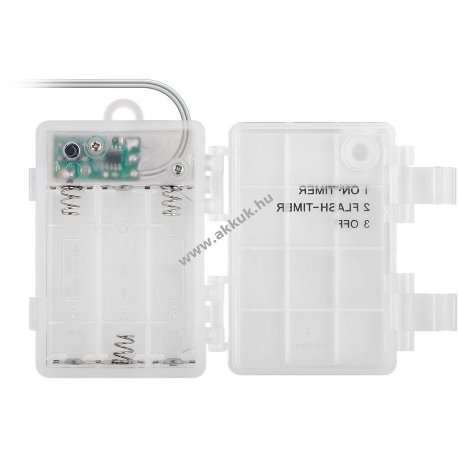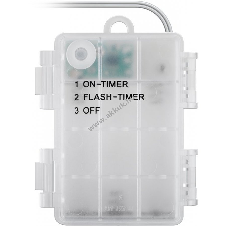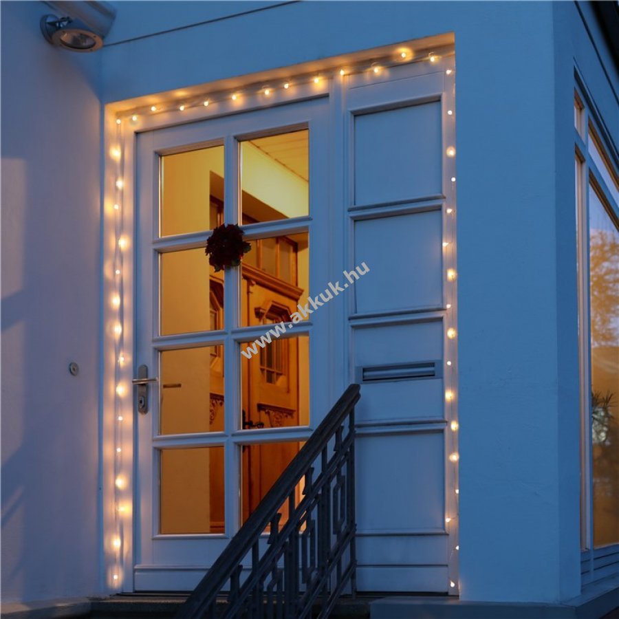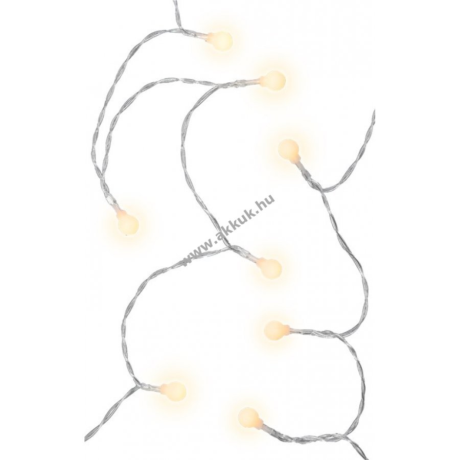 Elemmel működő LED fényfüzér melegfehér világítással beltéri és kültéri használatra IP44 védelemmel. Kiváló dekoráció növényekhez bútorokhoz függönyökhöz és falakhoz. Hangulatos fényt ad ünnepekre karácsonyra születésnapra esküvőre és szabadidős tevékenységekhez kempingezéshez. 6 órás bekapcsolás 18 órás kikapcsolás időzítővel. Kapcsoló három állással: folyamatos fény időzítővel villogó fény időzítővel és ki. Elem nélkül 3 darab AA elemmel működik. Teljes hossz 12,15 m bekötő vezeték 30 cm LED távolság 15 cm. Áttetsző kábel matt fehér műanyag gömbök átmérője 1,4 cm.
