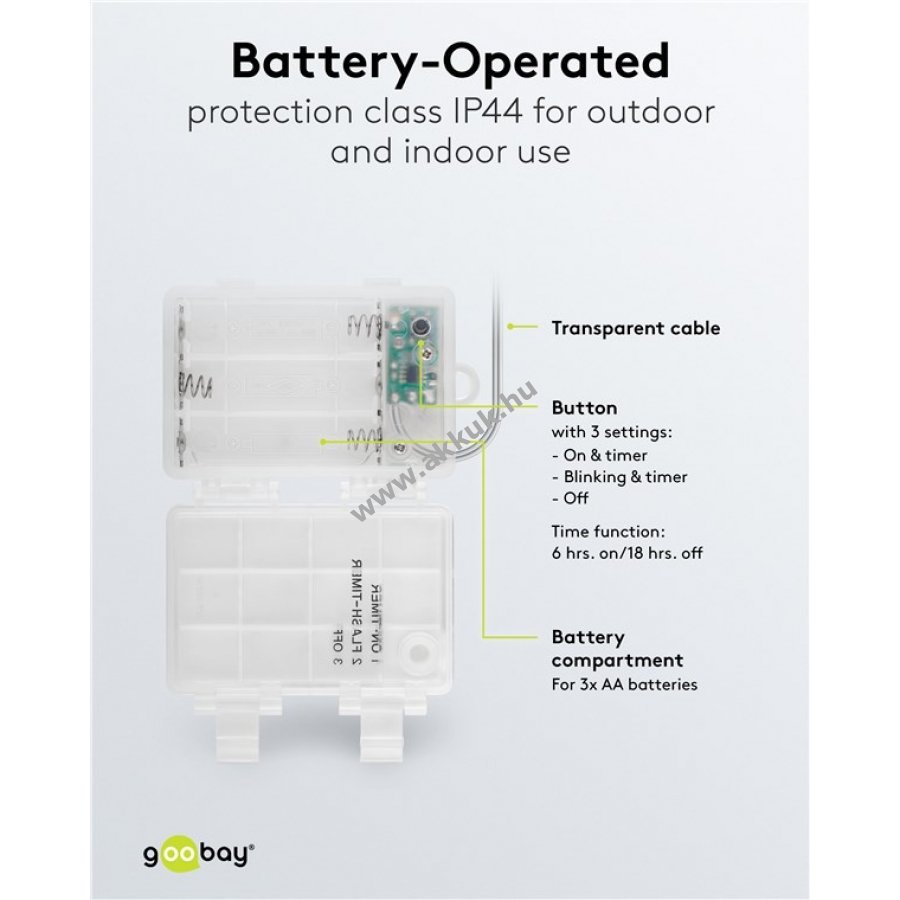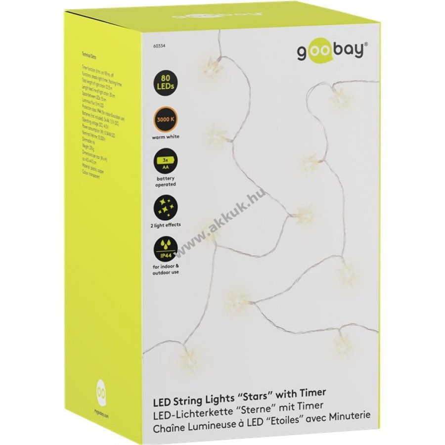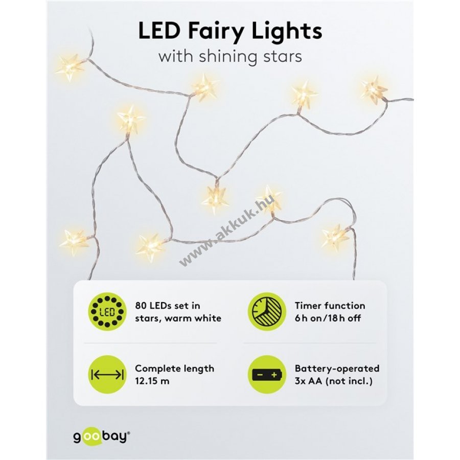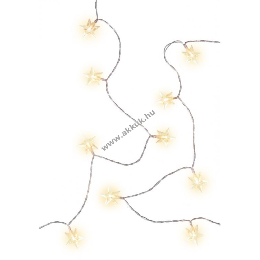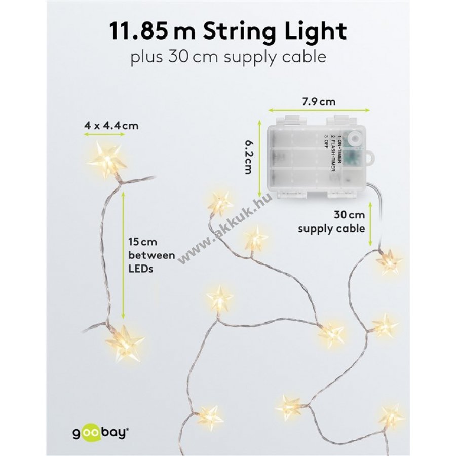 Elemes fényfüzér sokoldalú használatra beltéren és kültéren IP44 védettséggel 3000 K melegfehér fénnyel 80 darab csillag alakú műanyag LED-del 4 x 4,4 cm méretben 12,15 m teljes hosszúság 30 cm-es csatlakozóvezetékkel és 15 cm LED-távolsággal átlátszó kábelből időzítő funkció 6 óra világítás és 18 óra kikapcsolás kapcsoló 3 pozícióval: folyamatos fény/ időzítő villogó/ időzítő kikapcsolt működés elemmel működik 3 x AA elem szükséges (nem tartozék) alkalmas beltéri és kültéri dekorációhoz például kertben teraszon szobában születésnapra karácsonyra esküvőre vagy partira