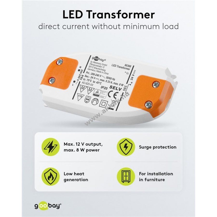 A trafó állandó 12 V egyenfeszültséget biztosít LED-ek számára nagy rugalmassággal különböző hosszúságú LED-szalagok csatlakoztatásához. Kompakt kialakítású LED trafó minimális terhelés nélkül 200-240 V hálózatról. 12 V egyenfeszültség lehetővé teszi párhuzamos kapcsolást és változó hosszúságú LED-szalagok használatát. Integrált csavaros kapcsokkal gyors és egyszerű telepítés. Alacsony hőtermelés és lapos forma helytakarékos beépítést tesz lehetővé, például bútorokba vagy szekrények mögé. Beltéri használatra IP20 védelemmel, biztonságos elektronikus szigeteléssel II. védelmi osztály szerint. Túlfeszültség- és rövidzárlatvédelem. Méretek 94,5 x 46,2 x 19,5 mm. Nem dimmelhető.