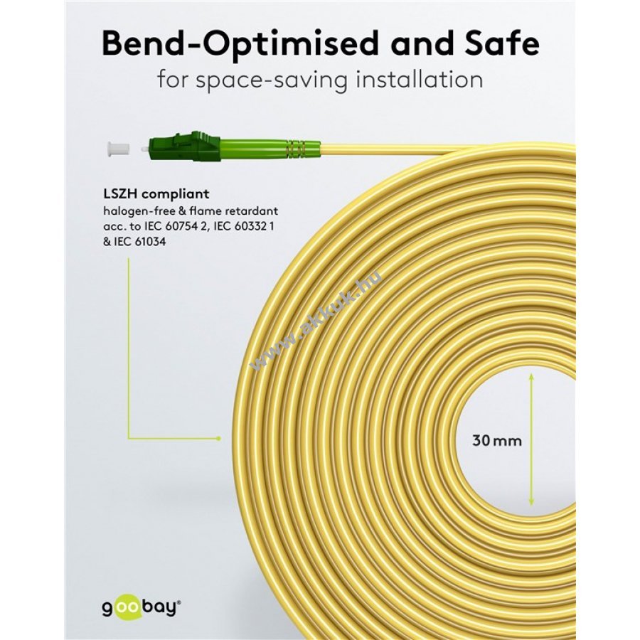Optikai kábel FTTH és ipari alkalmazásokhoz alkalmas. Kompatibilis Telekom Deutschland Vodafone Deutsche Glasfaser FTTH kínálatával. Biegeoptimalizált Singlemode OS2 szál 9/125µm alacsony csillapítással. 100 Gbit/s sebesség támogatása. Helytakarékos kivitel minimális 30 mm-es statikus hajlítási sugárral. LSZH szabvány szerinti halogénmentes és nehezen gyulladó köpeny. Aramid szálas húzáscsillapító a nagyobb tartósságért. Porvédő sapkával ellátott Simplex LC-APC csatlakozók 8°-os szögben. Egyedi tesztjegyzőkönyv visszaverődési és beillesztési veszteség mérésével.