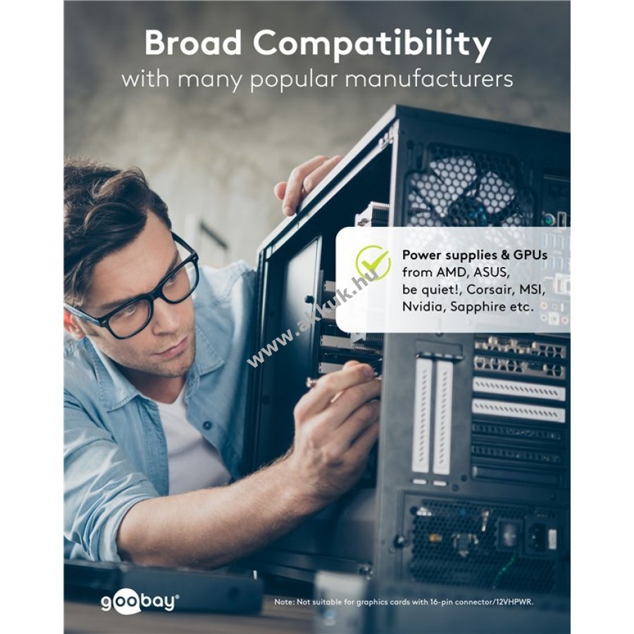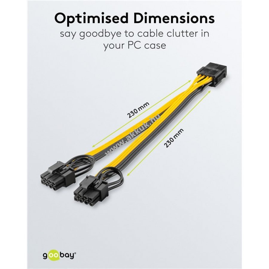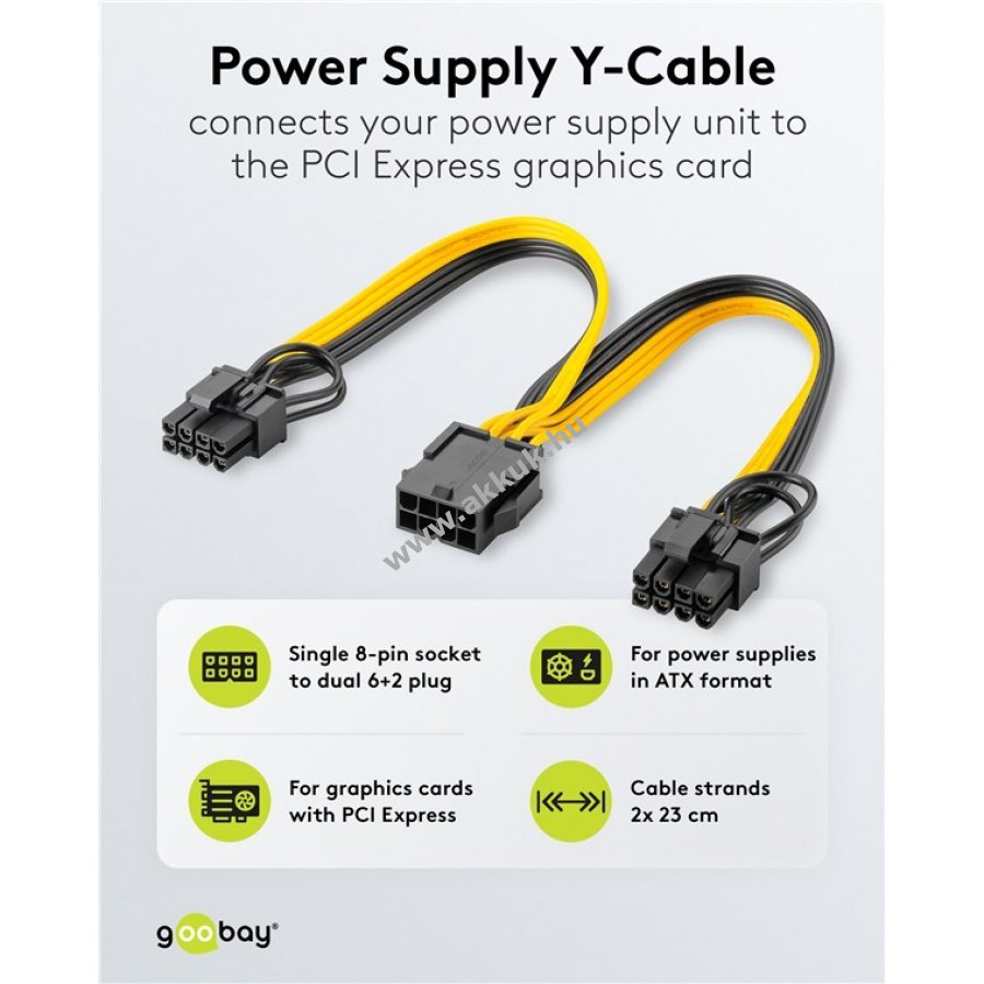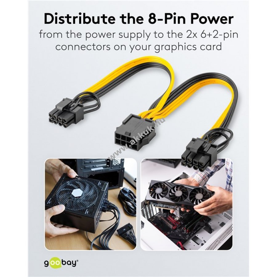 Tápkábel moduláris PC tápegységek és PCI Express grafikus kártyák csatlakoztatásához. Egy 8 tűs aljzat ATX tápegységekhez és két 6+2 tűs csatlakozó grafikus kártyákhoz. A PCIe csatlakozó igény szerint 6 vagy 8 tűvel kapcsolódik a GPU-hoz. Kompatibilis a legnépszerűbb márkákkal mint Corsair be quiet! AMD ASUS Gigabyte MSI Nvidia Sapphire. Kábelhossz: 2x 23 cm. Szín: sárga fekete. Nem alkalmas alaplap tápellátására.