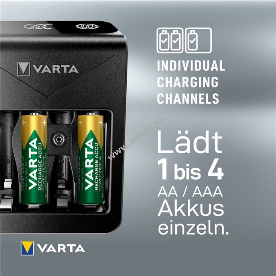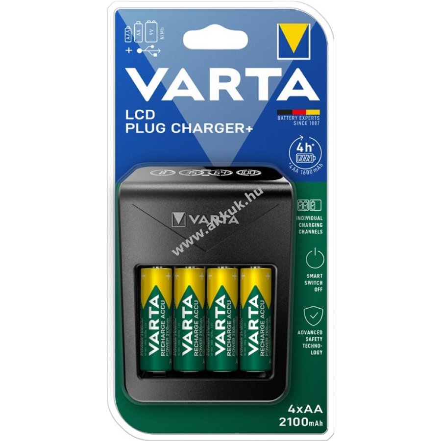 Könnyen leolvasható LCD-kijelzővel, egyszerű kezelhetőséggel és modern kialakítással rendelkező VARTA LCD Plug Charger+ 57687 hálózati töltő, amely egyszerre tölthet 1 db 9V akkumulátort vagy 1-4 db AA/AAA akkut a csomag 4db AA 2100mAh NiMH elemet tartalmaz.