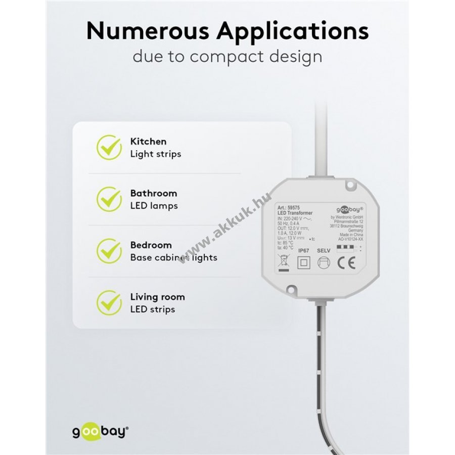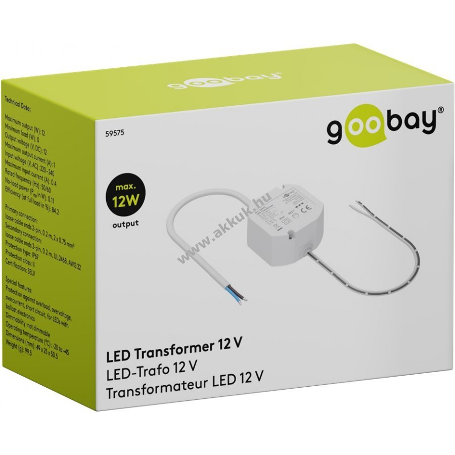 LED-ekhez 12 V egyenfeszültséget biztosít 12 W teljesítményig. Ideális nedves helyiségekbe és kültéri használatra például fürdőszobai és kerti világításhoz vagy medencevilágításhoz.
