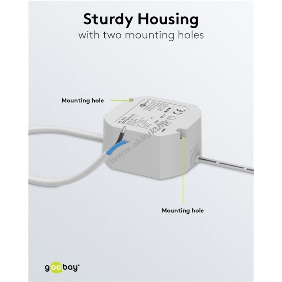 Kompakt és könnyű kivitel, ideális LED-lámpákhoz, szalagokhoz és konyhai világításhoz.