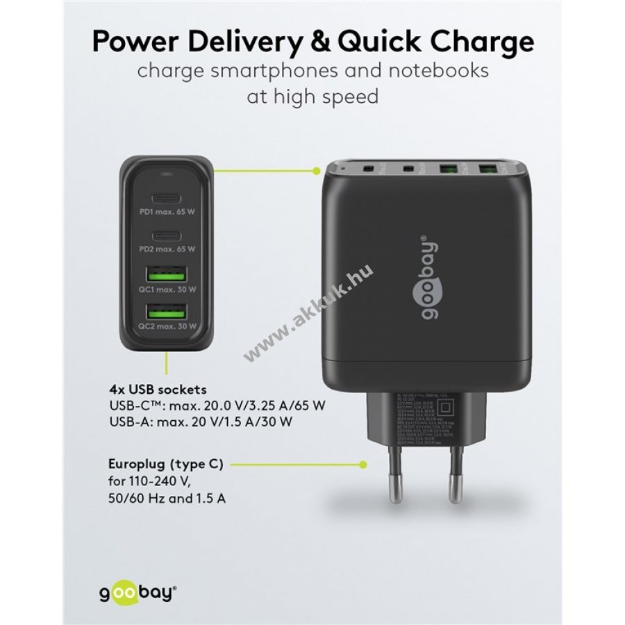 Gyors töltési mód laptopokhoz USB-C Power Delivery-n keresztül és okostelefonokhoz USB-A Quick Charge-tal.