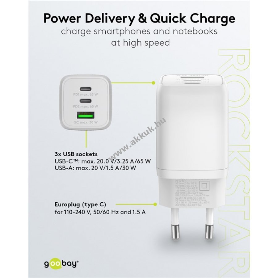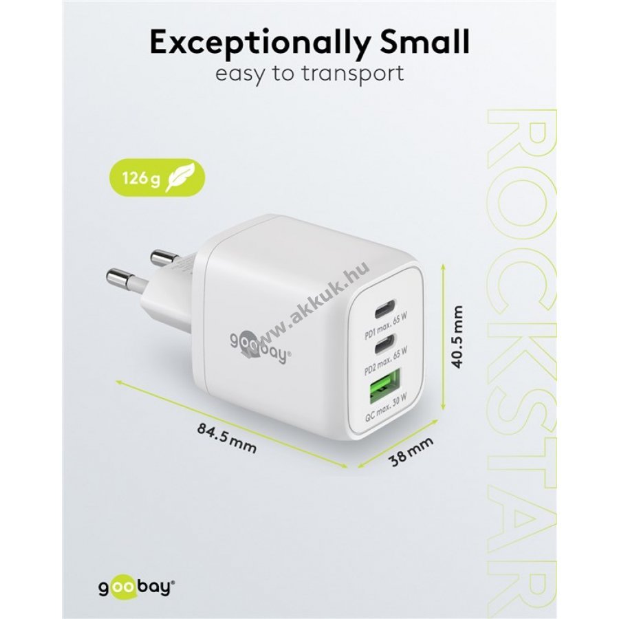 Kompakt kialakítás magas teljesítmény és energiahatékonyság egy készülékben 65W teljesítmény és univerzális USB-C csatlakozók minden eszközhöz gyors töltés USB-C Power Delivery és USB-A Quick Charge 3.0 technológiával GaN félvezetők a gyorsabb és hatékonyabb töltésért helytakarékos és könnyű kivitel három eszköz egyidejű töltésére alkalmas kompatibilis számos okostelefonnal és notebookkal Apple Samsung Xiaomi LG Huawei Acer HP Fujitsu Razer